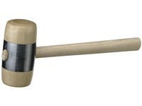 Młotek z drewnianym trzonkiem oraz drewnianym obuchem z metalową obręczą.