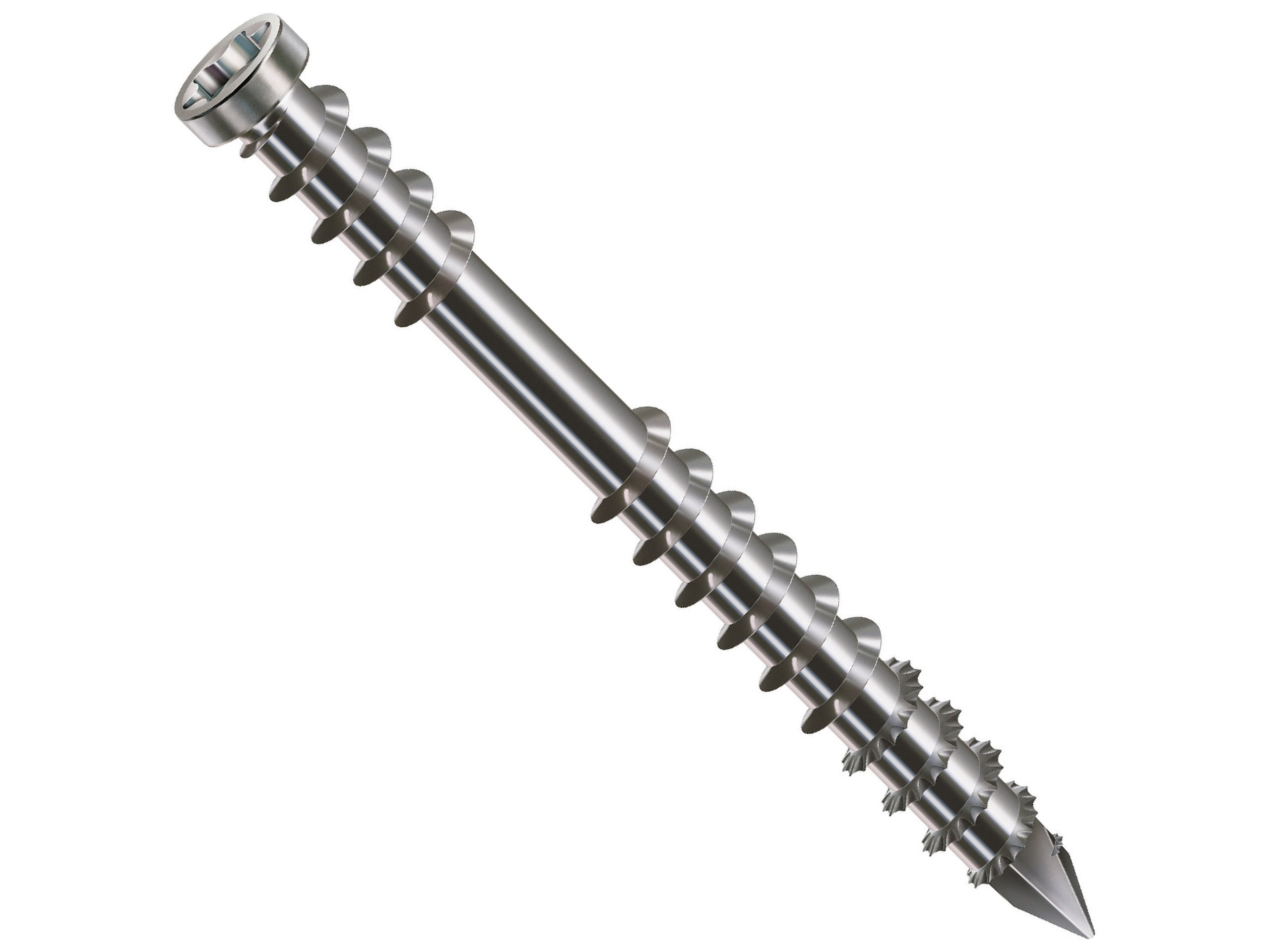 Wkręt SPAX®-D do tarasów z główką cylindryczną, pokryty powłoką zmniejszającą tarcie. Wykonany ze szlachetnej stali nierdzewnej A2(II). Gniazdo SPAX T-STAR plus, szpic SPAX 4CUT, gwint dociągający.
