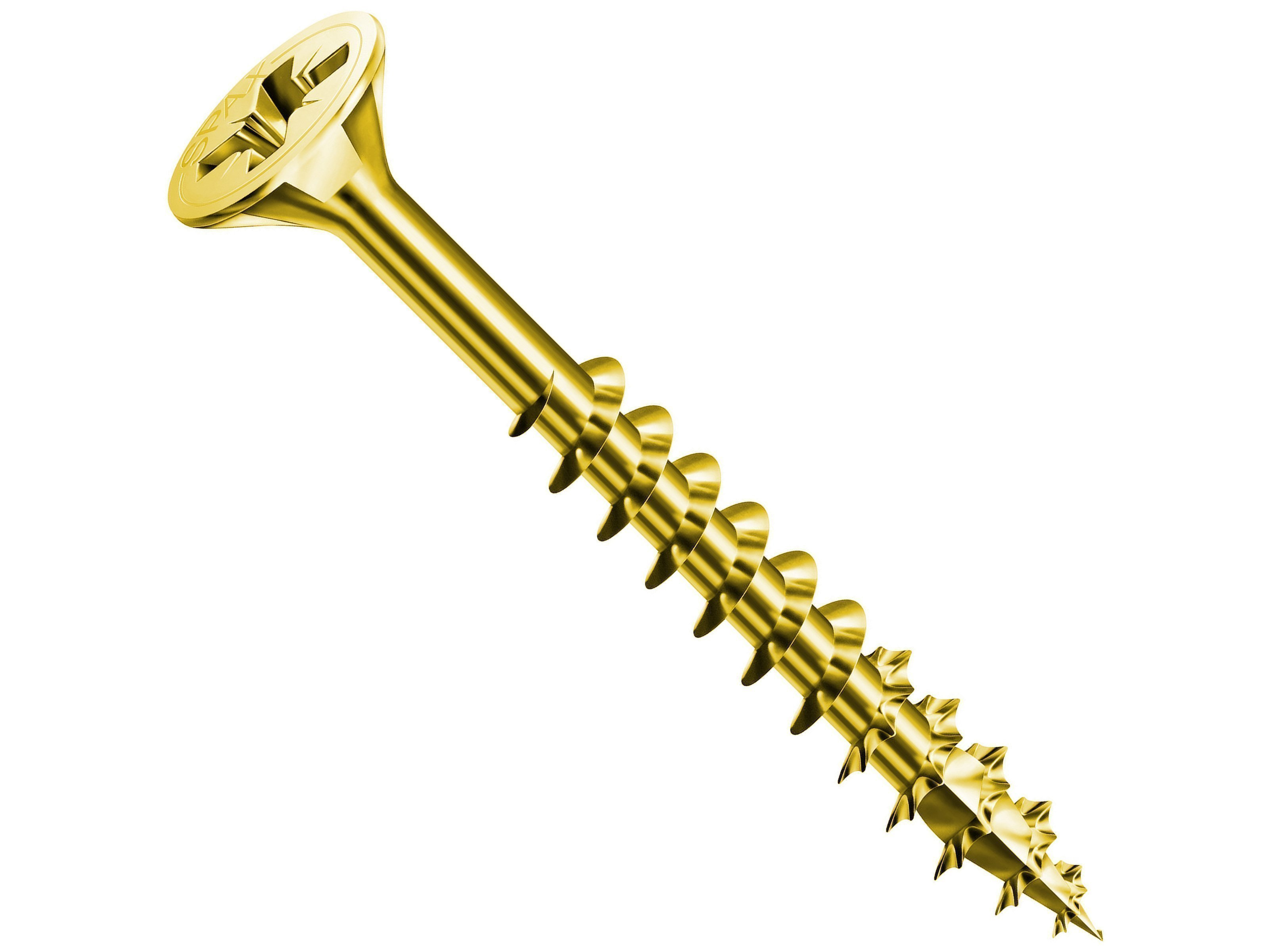 Wkręt uniwersalny hartowany z główką stożkową, pokryty powłoką zmniejszającą tarcie. Ocynkowany, pasywowany na żółto (A2L). Gniazdo Pz, główka SPAX MULTI, szpic SPAX 4CUT, gwint częściowy.