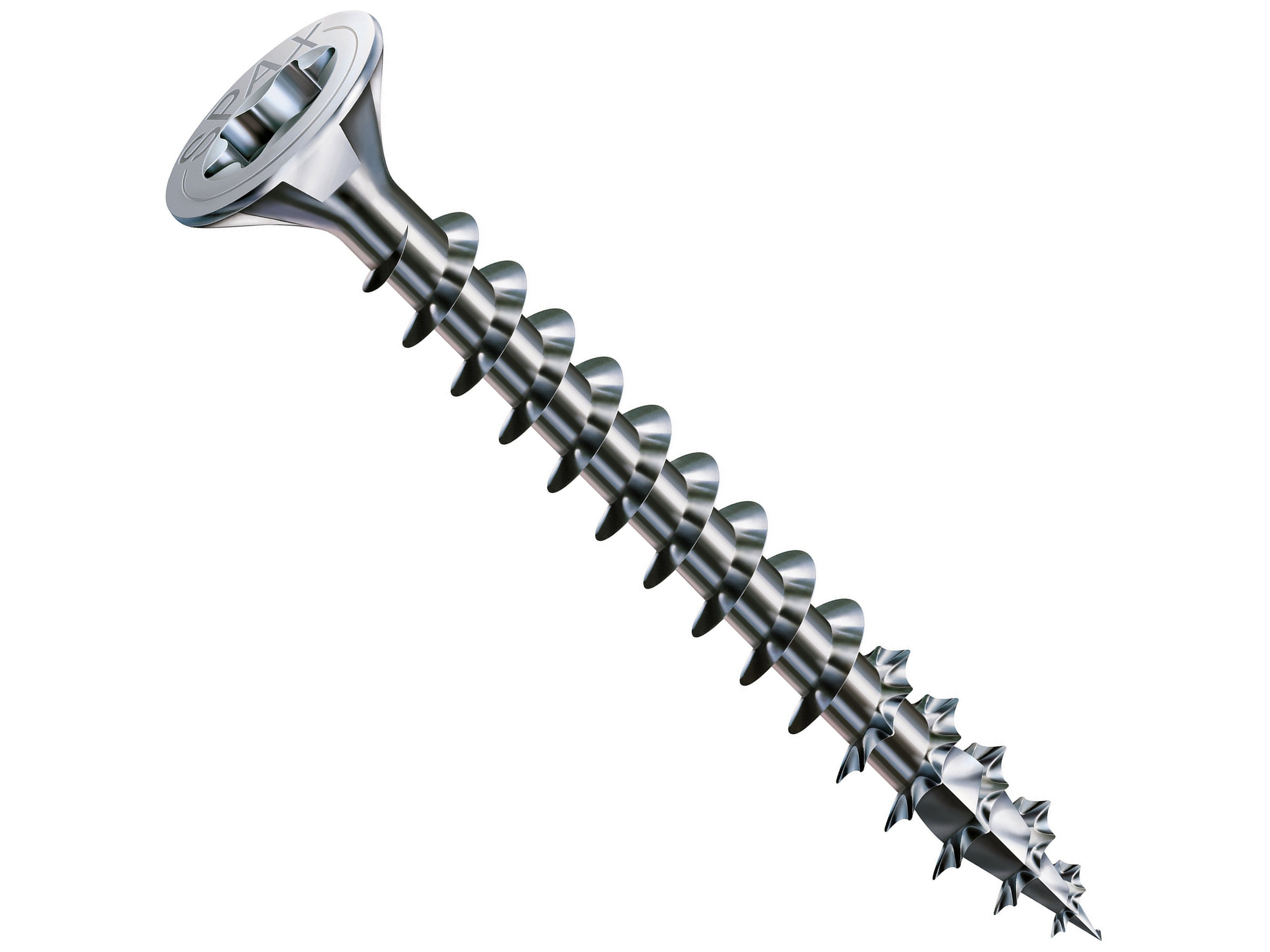 Wkręt uniwersalny hartowany z główką stożkową, pokryty powłoką zmniejszającą tarcie. Ocynkowany (stal A2J). Gniazdo SPAX T-STAR plus, główka SPAX MULTI, szpic SPAX 4CUT, gwint pełny.