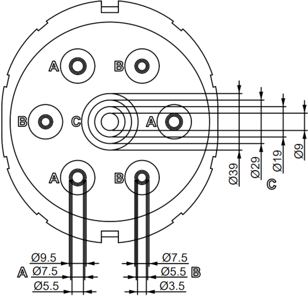 Siedem portów (A, B, C) o zakresie średnic od 3,5 do 39 mm umożliwia elastyczne prowadzenie zarówno pojedynczych przewodów, jak i większych wiązek kablowych. Elastyczna konstrukcja portów zapewnia wodoszczelne i pyłoszczelne połączenie.