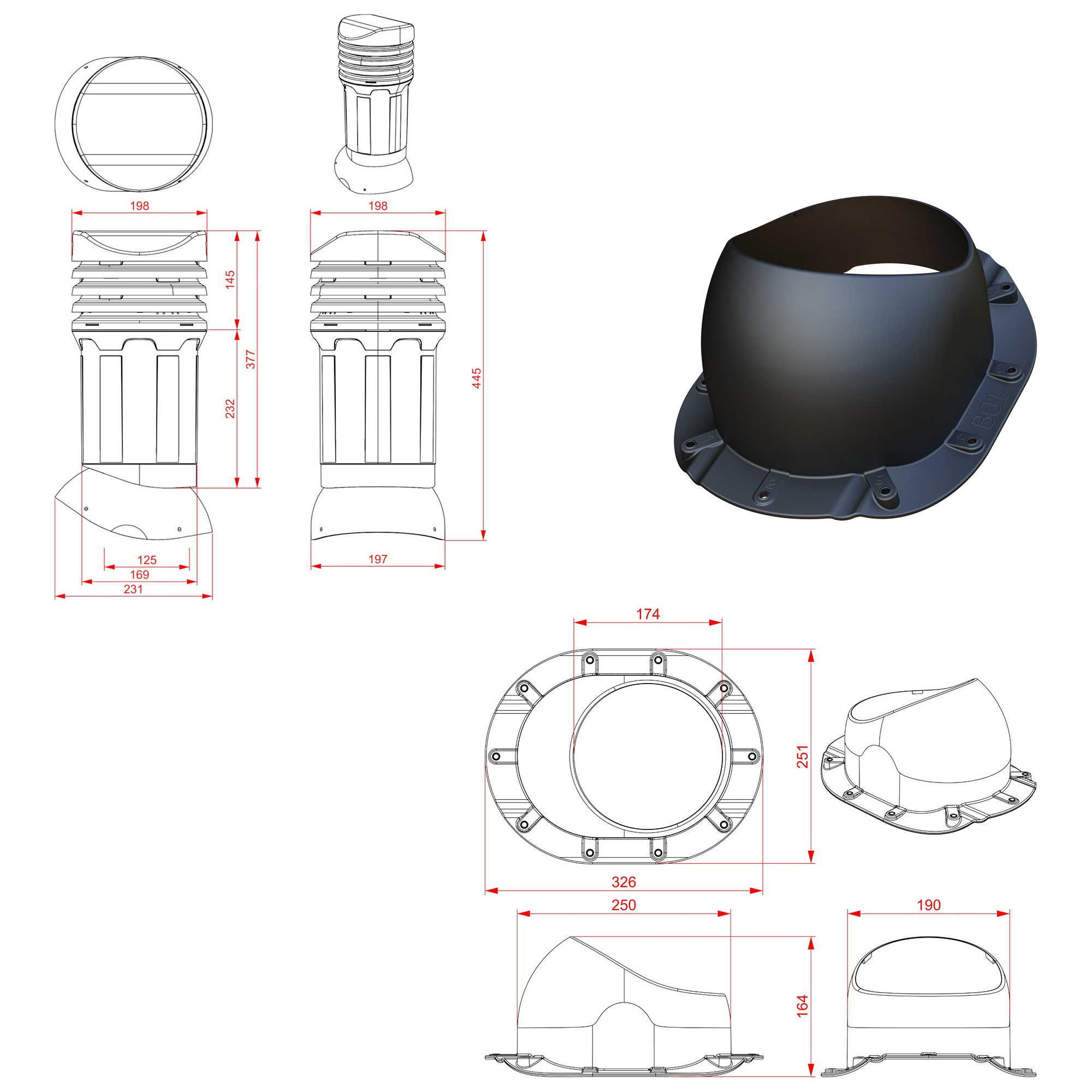 Kompletny kominek wentylacyjny z profilowanym przejściem dachowym, montowany bezpośrednio na blachodachówce. Specjalne kanały odprowadzają skropliny (kondensat) na pokrycie dachowe.