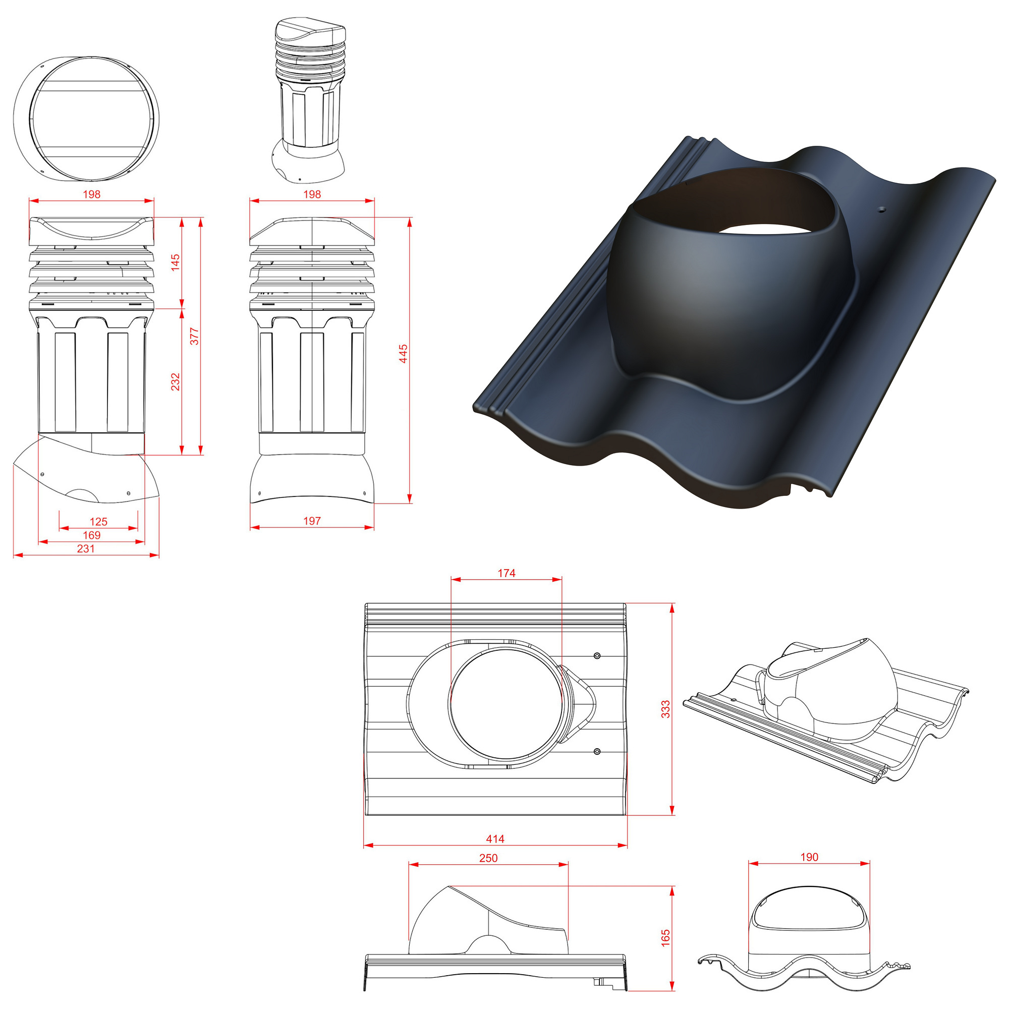 Kompletny kominek wentylacyjny z profilowanym przejściem dachowym, montowany bezpośrednio na dachówce. Specjalne kanały odprowadzają skropliny (kondensat) na pokrycie dachowe.