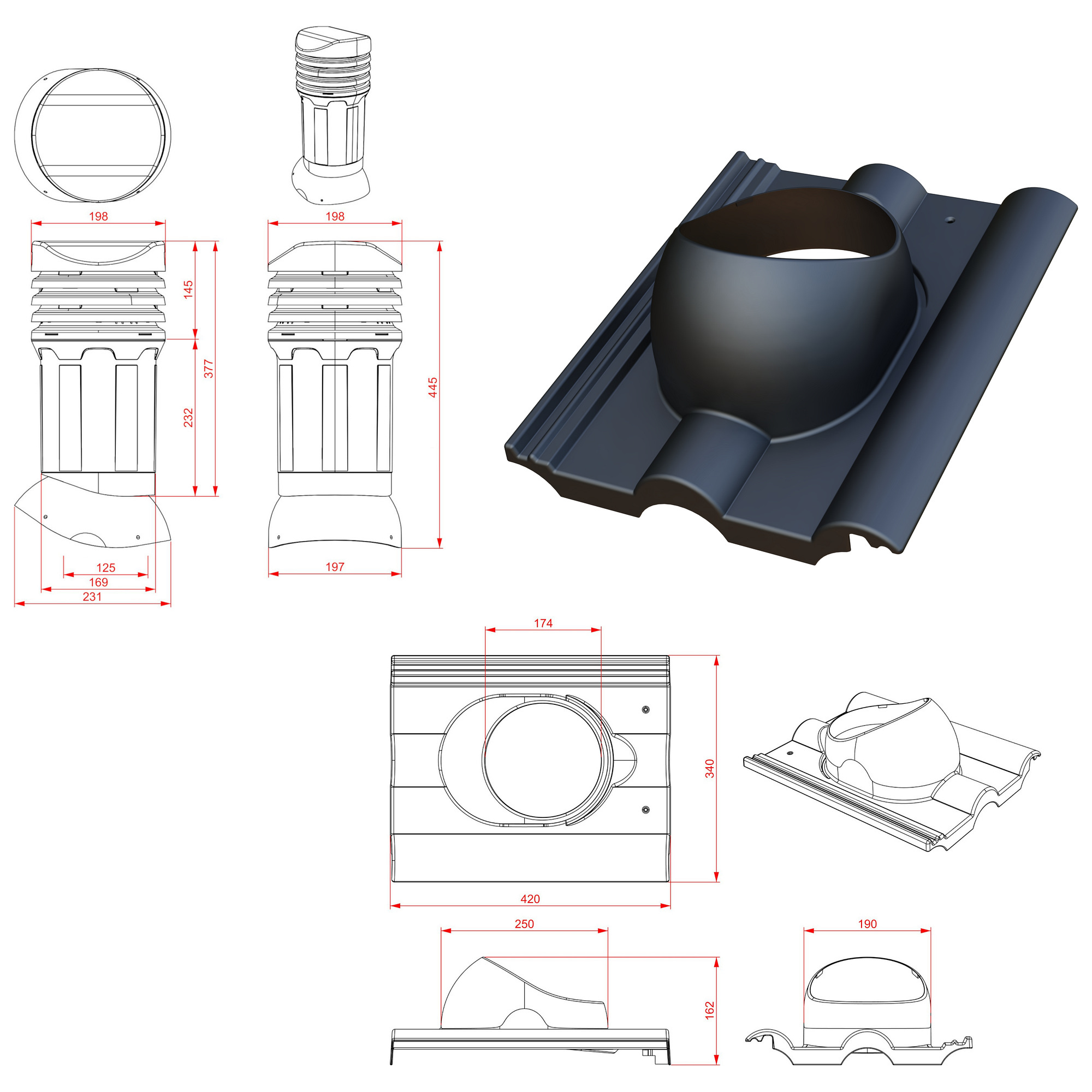 Kompletny kominek wentylacyjny z profilowanym przejściem dachowym, montowany bezpośrednio na dachówce. Specjalne kanały odprowadzają skropliny (kondensat) na pokrycie dachowe.