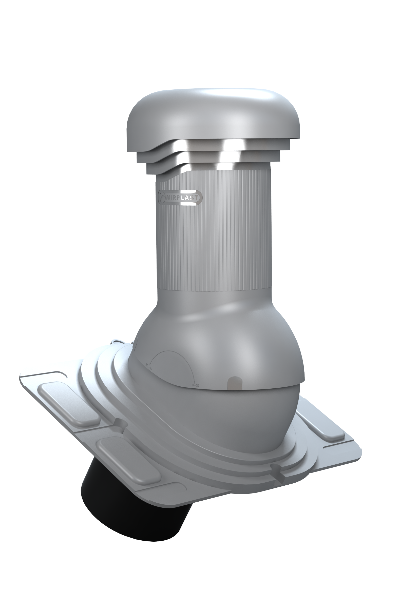UNIWERSAL PRO DN 150 - Kompletny kominek wentylacyjny z profilowanym przejściem dachowym, montowany bezpośrednio na blachodachówce i pokryciach profilowanych. Specjalne kanały odprowadzają skropliny (kondensat) na pokrycie dachowe.