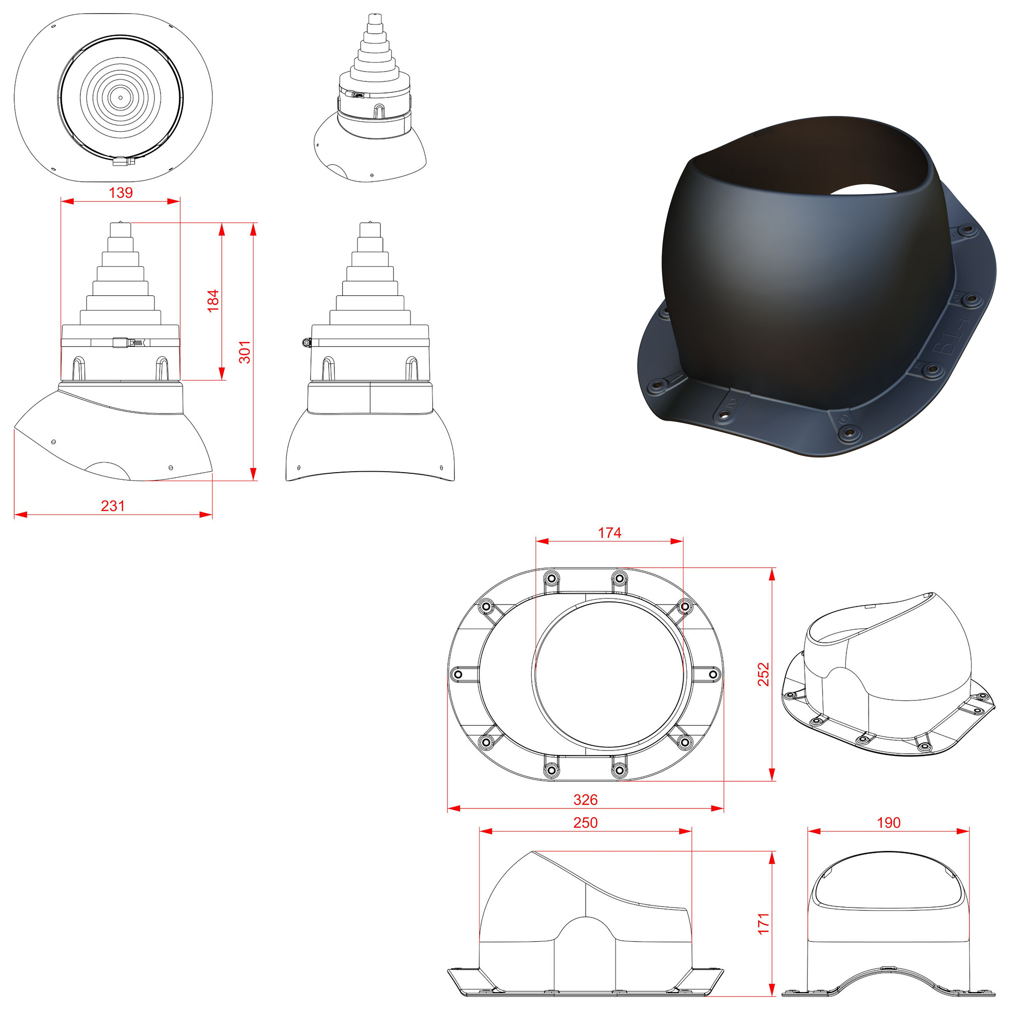 Przejście antenowe umożliwia łatwe i szczelne wyprowadzenie masztu antenowego ponad dach. Nasadka umożliwia dostosowanie otworu do średnicy masztu w zakresie 19-90 mm.