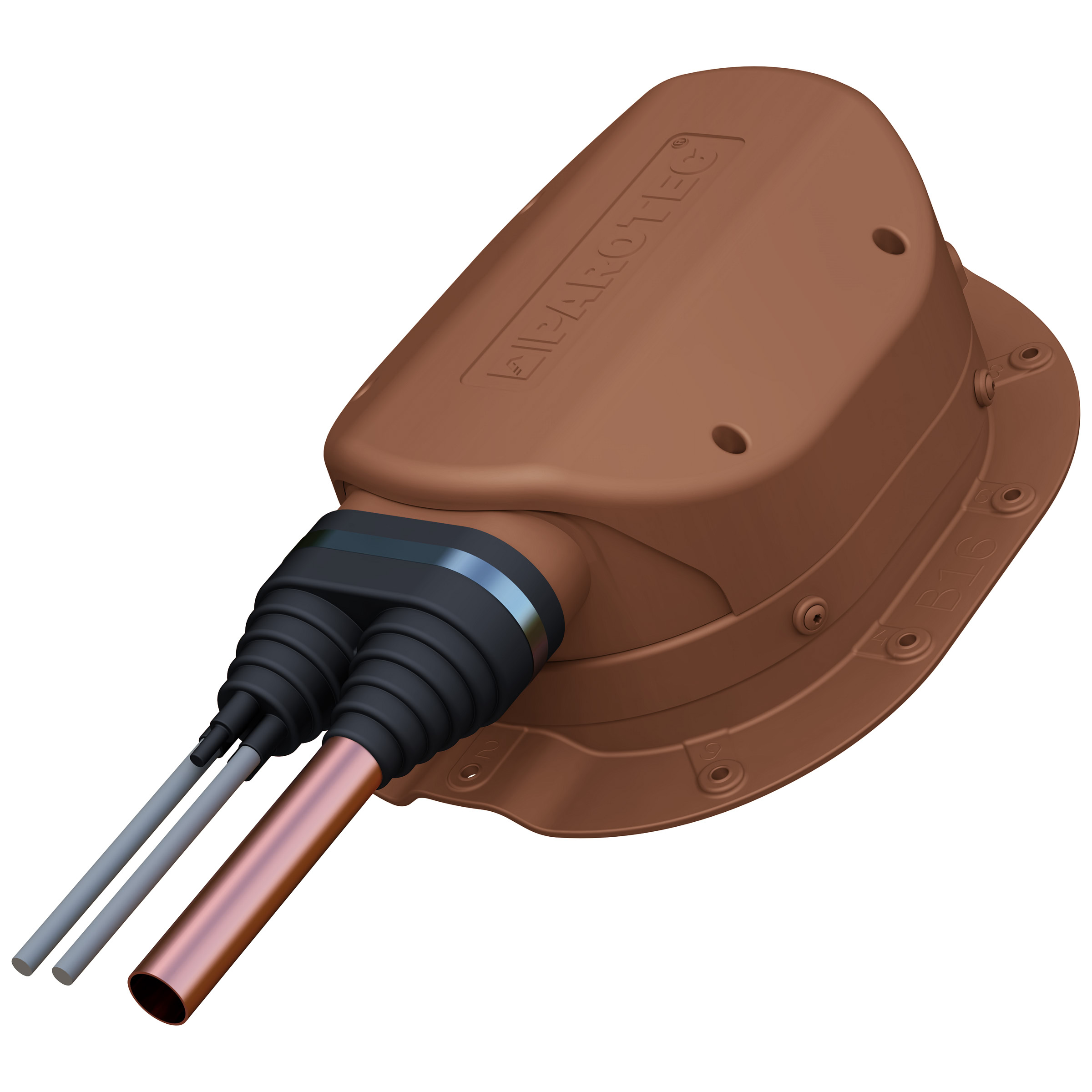 Przejście do solarów i fotowoltaiki to wodoszczelne rozwiązanie przeprowadzania instalacji solarnych i paneli fotowoltaicznych przez połać dachową. Produkt został zaprojektowany dla podwójnych i pojedynczych przewodów. Nasadka umożliwia dostosowanie otworu do średnicy w zakresie 6-48 mm.