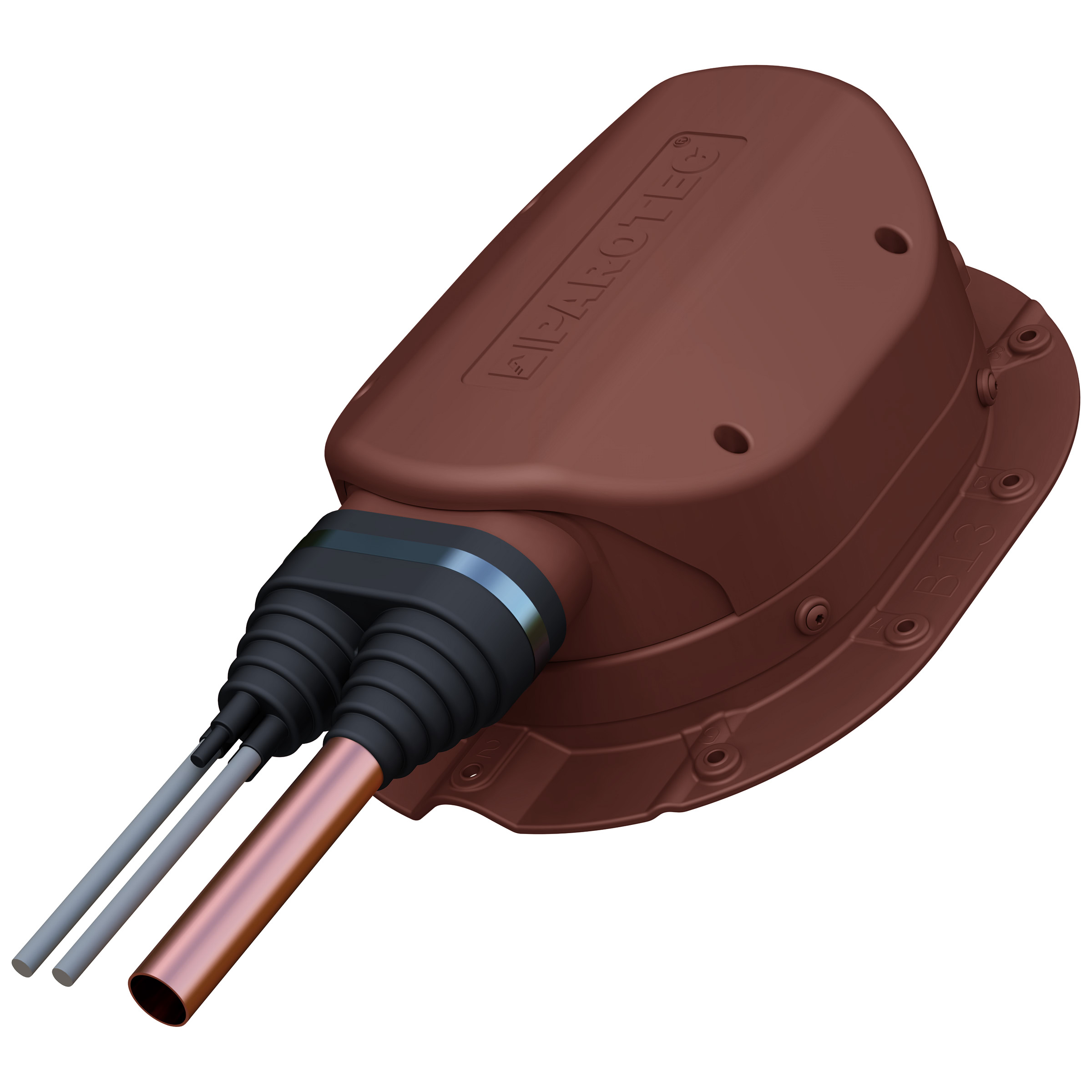 Przejście do solarów i fotowoltaiki to wodoszczelne rozwiązanie przeprowadzania instalacji solarnych i paneli fotowoltaicznych przez połać dachową. Produkt został zaprojektowany dla podwójnych i pojedynczych przewodów. Nasadka umożliwia dostosowanie otworu do średnicy w zakresie 6-48 mm.