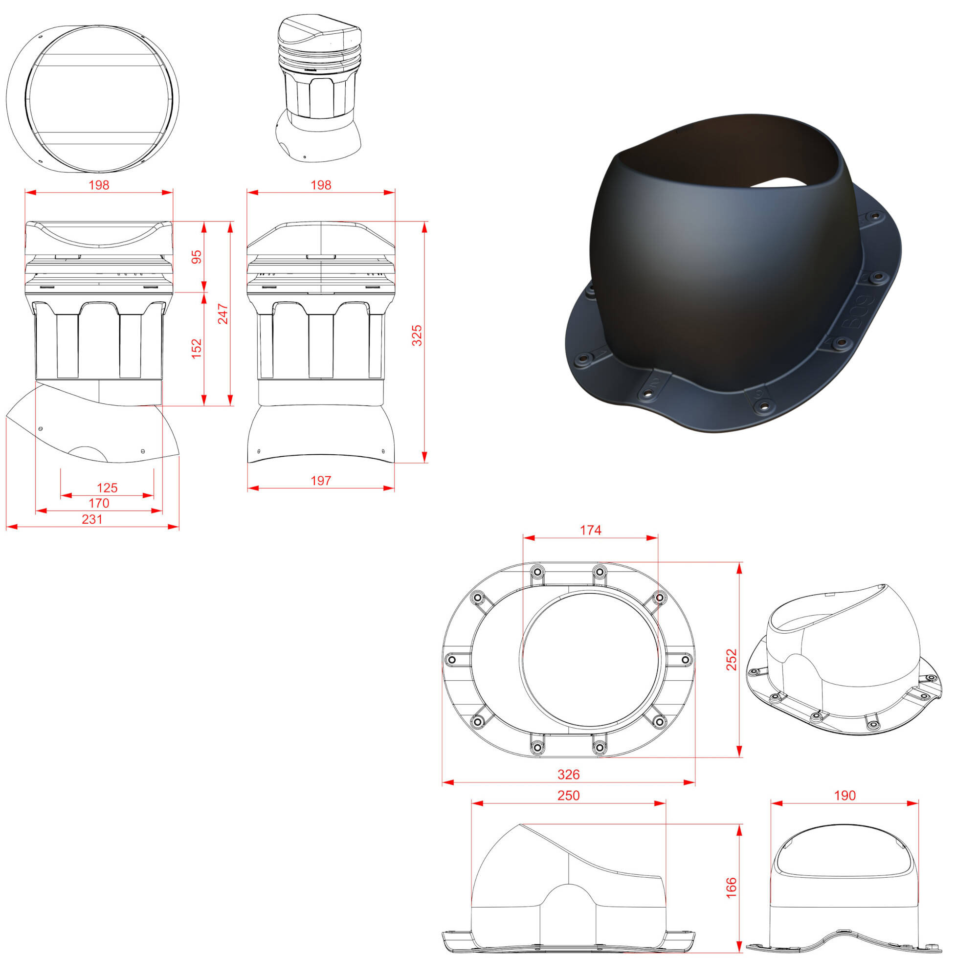 Minimalistyczny design – Niższa wysokość kominka dyskretnie wtapia się w dach, zmniejszając podatność na działanie wiatru i lepiej radząc sobie w trudnych warunkach pogodowych. Idealnie dopasowany do mniej wymagających instalacji, takich jak systemy kanalizacyjne czy wspomagane wentylatorami.