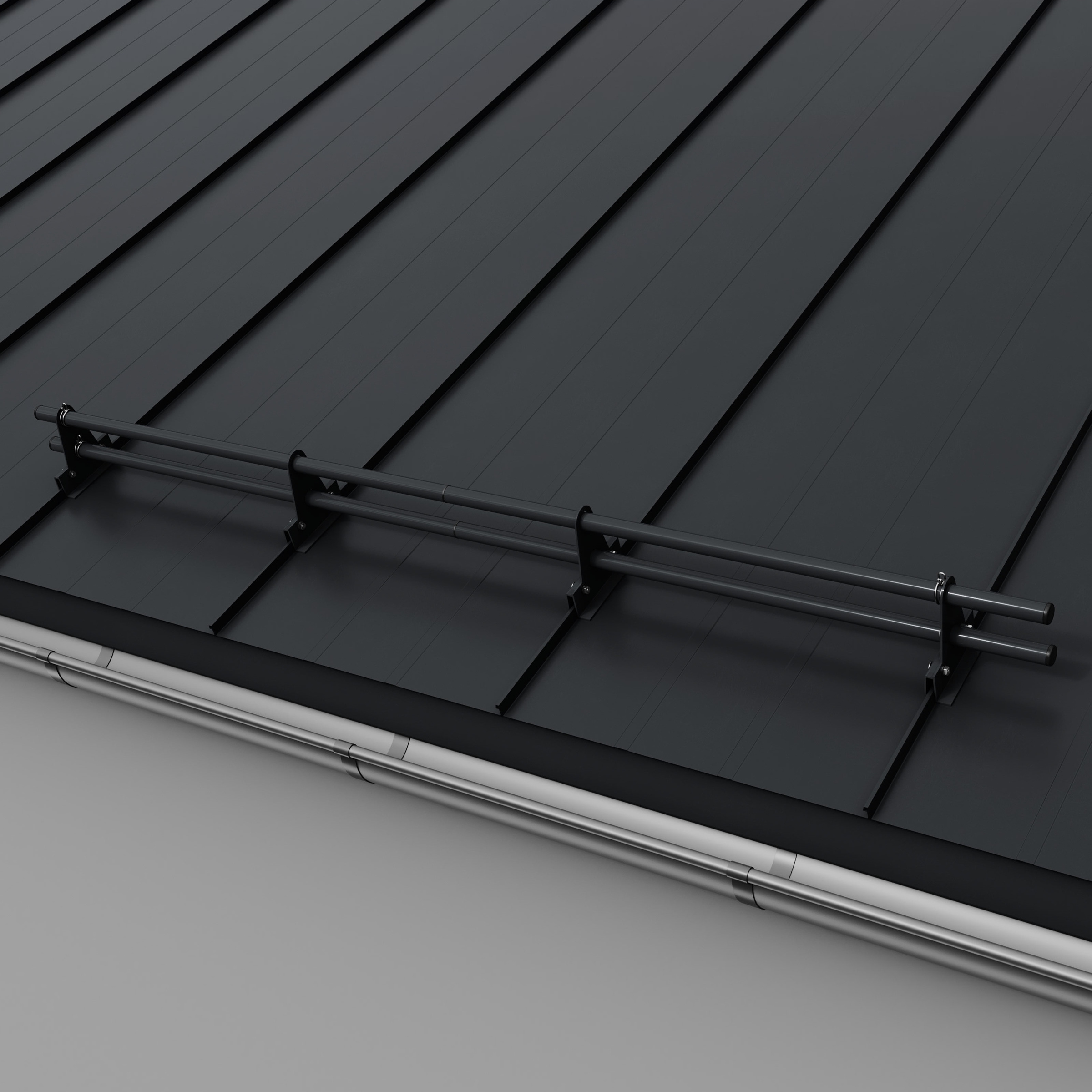 Kompletny zestaw ochrony rurowej RABEK składa się z rury i uchwytów. Uchwyt przykręcamy do rąbka stojącego tak, aby ruchomy element klamry dopasował się do zamka blachy. Klamrę wspornika zamykamy poprzez skręcenie jej śrubami zamkowymi M8x35. Ze względu na ograniczony dostęp do nakrętek zalecane jest użycie klucza grzechotki z nasadką nr 13. Montaż rury do uchwytu nie wymaga stosowania połączeń śrubowych. Liczba uchwytów potrzebnych do zamontowania rury zależy od kąta nachylenia dachu (im większy kąt, tym większa liczba uchwytów) oraz długości połaci. Dla dachów o długości połaci powyżej 6 m należy zwiększyć liczbę uchwytów lub zastosować drugi rząd ochrony rurowej.