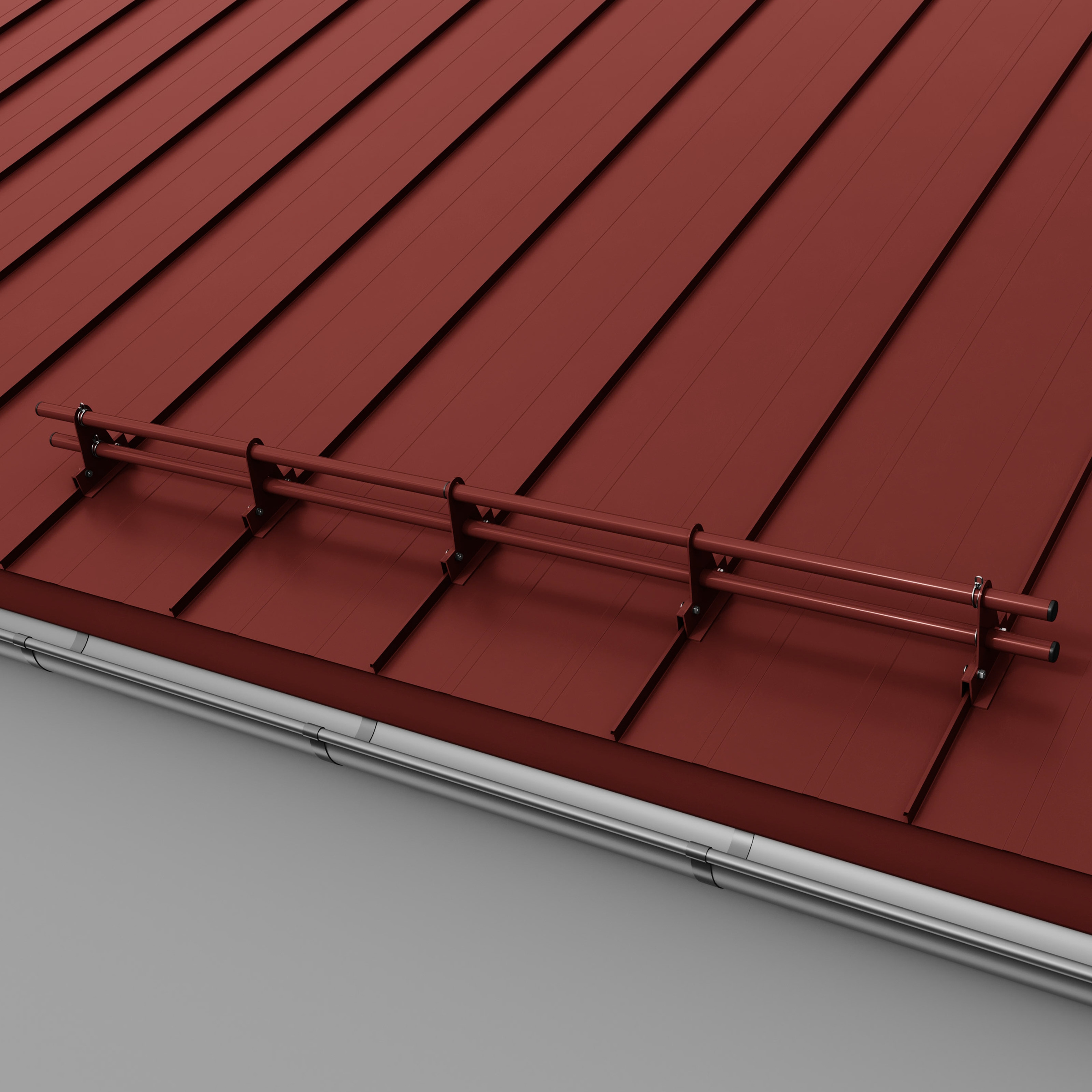 Kompletny zestaw ochrony rurowej RABEK składa się z rury i uchwytów. Uchwyt przykręcamy do rąbka stojącego tak, aby ruchomy element klamry dopasował się do zamka blachy. Klamrę wspornika zamykamy poprzez skręcenie jej śrubami zamkowymi M8x35. Ze względu na ograniczony dostęp do nakrętek zalecane jest użycie klucza grzechotki z nasadką nr 13. Montaż rury do uchwytu nie wymaga stosowania połączeń śrubowych. Liczba uchwytów potrzebnych do zamontowania rury zależy od kąta nachylenia dachu (im większy kąt, tym większa liczba uchwytów) oraz długości połaci. Dla dachów o długości połaci powyżej 6 m należy zwiększyć liczbę uchwytów lub zastosować drugi rząd ochrony rurowej.