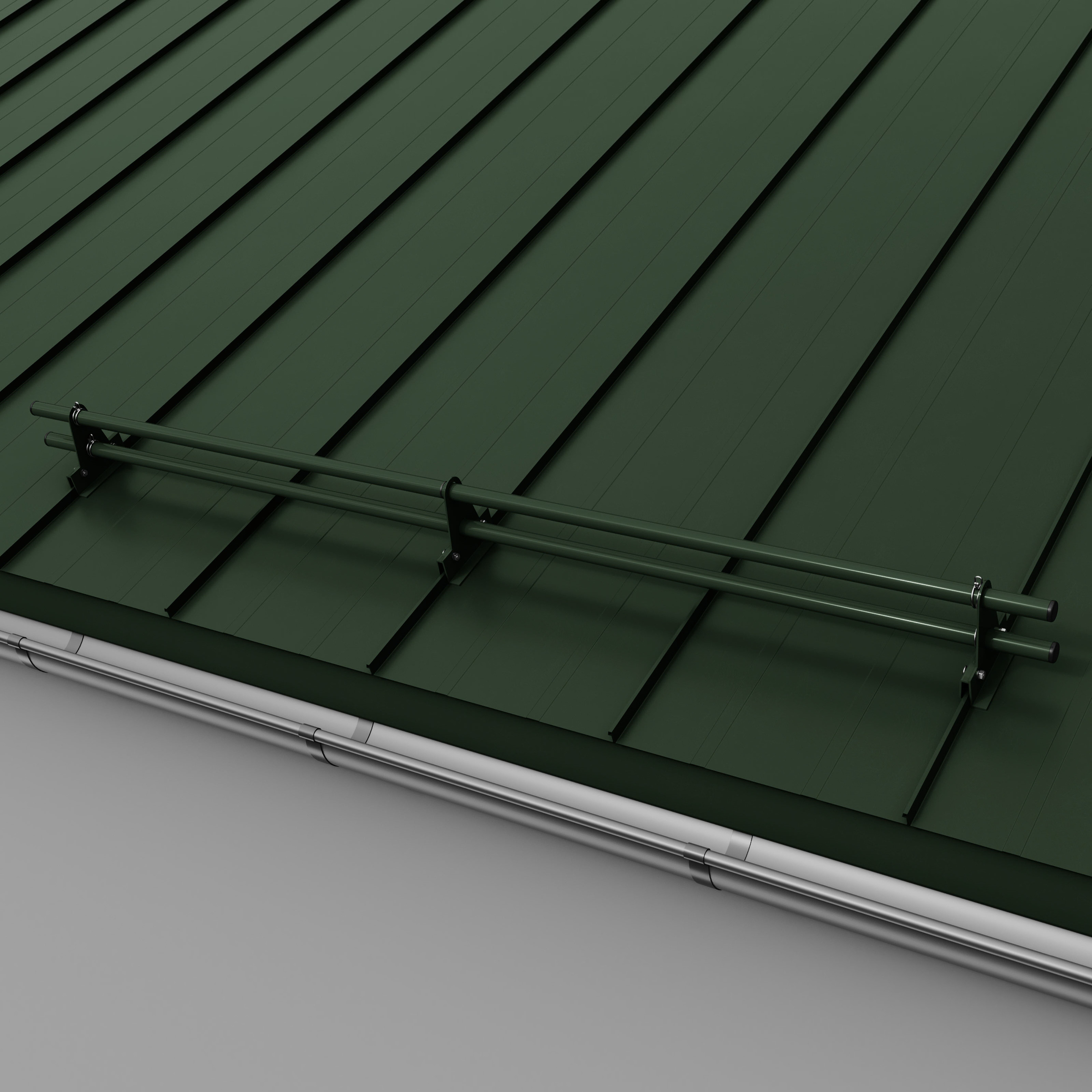 Kompletny zestaw ochrony rurowej RABEK składa się z rury i uchwytów. Uchwyt przykręcamy do rąbka stojącego tak, aby ruchomy element klamry dopasował się do zamka blachy. Klamrę wspornika zamykamy poprzez skręcenie jej śrubami zamkowymi M8x35. Ze względu na ograniczony dostęp do nakrętek zalecane jest użycie klucza grzechotki z nasadką nr 13. Montaż rury do uchwytu nie wymaga stosowania połączeń śrubowych. Liczba uchwytów potrzebnych do zamontowania rury zależy od kąta nachylenia dachu (im większy kąt, tym większa liczba uchwytów) oraz długości połaci. Dla dachów o długości połaci powyżej 6 m należy zwiększyć liczbę uchwytów lub zastosować drugi rząd ochrony rurowej.