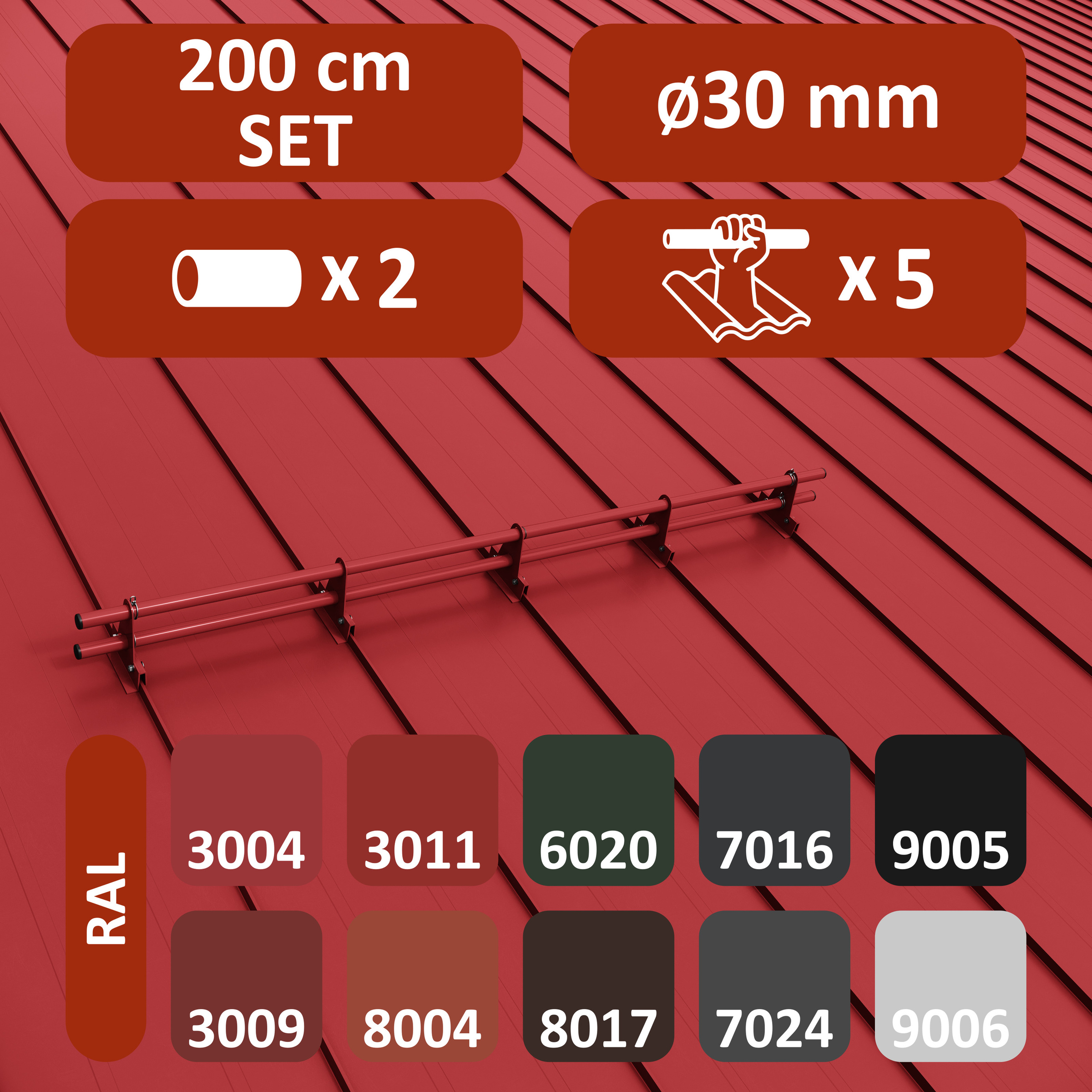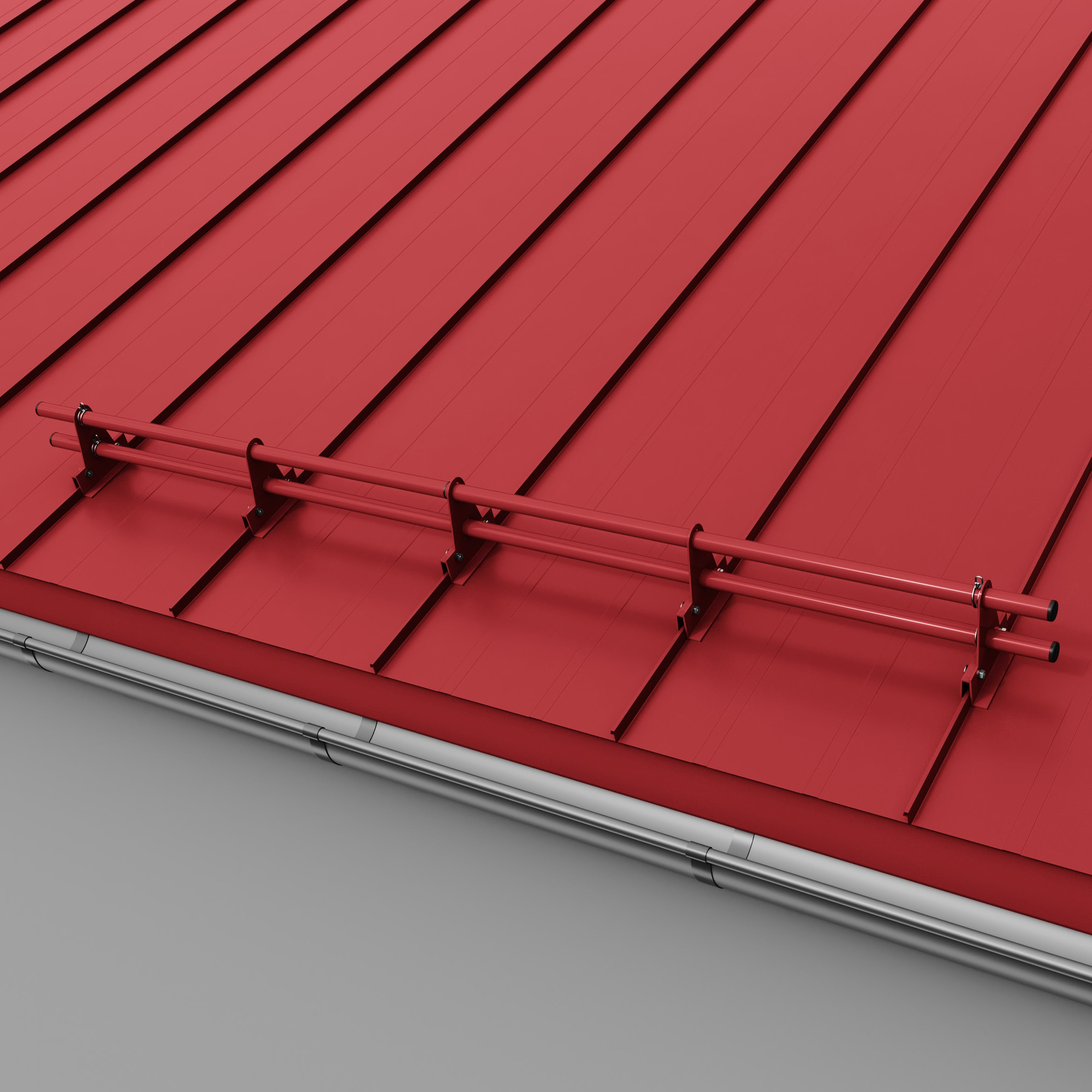 Kompletny zestaw ochrony rurowej RABEK składa się z rury i uchwytów. Uchwyt przykręcamy do rąbka stojącego tak, aby ruchomy element klamry dopasował się do zamka blachy. Klamrę wspornika zamykamy poprzez skręcenie jej śrubami zamkowymi M8x35. Ze względu na ograniczony dostęp do nakrętek zalecane jest użycie klucza grzechotki z nasadką nr 13. Montaż rury do uchwytu nie wymaga stosowania połączeń śrubowych. Liczba uchwytów potrzebnych do zamontowania rury zależy od kąta nachylenia dachu (im większy kąt, tym większa liczba uchwytów) oraz długości połaci. Dla dachów o długości połaci powyżej 6 m należy zwiększyć liczbę uchwytów lub zastosować drugi rząd ochrony rurowej.