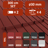 • Komplet ochrony rurowej dostępny w długościach 200 cm i 300 cm. Występuje w 10 kolorach. Zestawy zawierają 3, 4 lub 5 uchwytów – w zależności od kąta nachylenia dachu. Typ mocowania - na rąbek o wysokości do 28 mm.