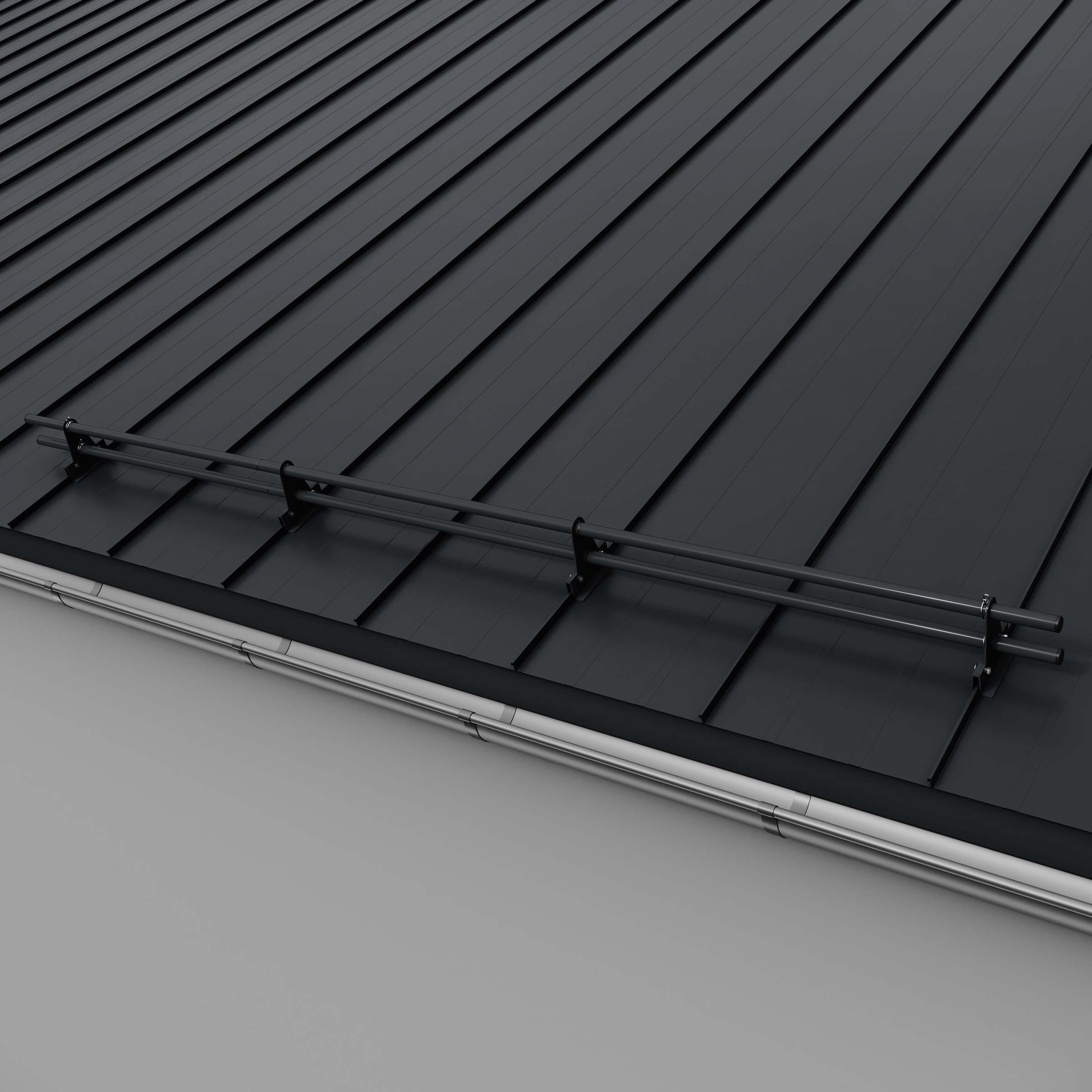 Kompletny zestaw ochrony rurowej RABEK składa się z rury i uchwytów. Uchwyt przykręcamy do rąbka stojącego tak, aby ruchomy element klamry dopasował się do zamka blachy. Klamrę wspornika zamykamy poprzez skręcenie jej śrubami zamkowymi M8x35. Ze względu na ograniczony dostęp do nakrętek zalecane jest użycie klucza grzechotki z nasadką nr 13. Montaż rury do uchwytu nie wymaga stosowania połączeń śrubowych. Liczba uchwytów potrzebnych do zamontowania rury zależy od kąta nachylenia dachu (im większy kąt, tym większa liczba uchwytów) oraz długości połaci. Dla dachów o długości połaci powyżej 6 m należy zwiększyć liczbę uchwytów lub zastosować drugi rząd ochrony rurowej.