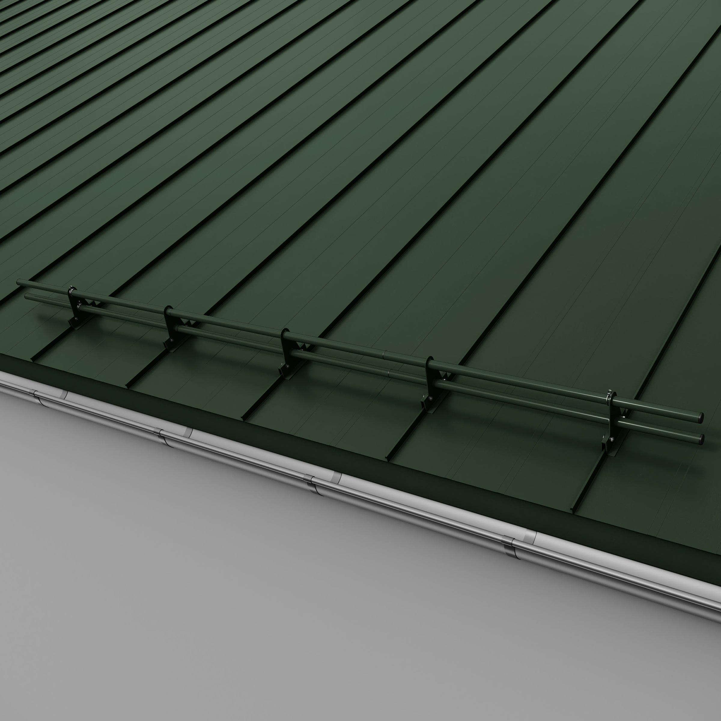 Kompletny zestaw ochrony rurowej RABEK składa się z rury i uchwytów. Uchwyt przykręcamy do rąbka stojącego tak, aby ruchomy element klamry dopasował się do zamka blachy. Klamrę wspornika zamykamy poprzez skręcenie jej śrubami zamkowymi M8x35. Ze względu na ograniczony dostęp do nakrętek zalecane jest użycie klucza grzechotki z nasadką nr 13. Montaż rury do uchwytu nie wymaga stosowania połączeń śrubowych. Liczba uchwytów potrzebnych do zamontowania rury zależy od kąta nachylenia dachu (im większy kąt, tym większa liczba uchwytów) oraz długości połaci. Dla dachów o długości połaci powyżej 6 m należy zwiększyć liczbę uchwytów lub zastosować drugi rząd ochrony rurowej.