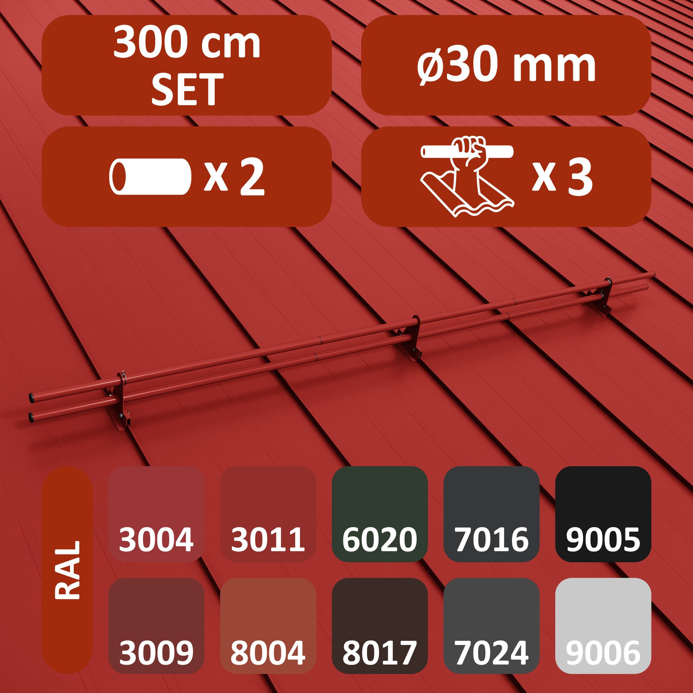 • Komplet ochrony rurowej dostępny w długościach 200 cm i 300 cm. Występuje w 10 kolorach. Zestawy zawierają 3, 4 lub 5 uchwytów – w zależności od kąta nachylenia dachu. Typ mocowania - na rąbek o wysokości do 28 mm.