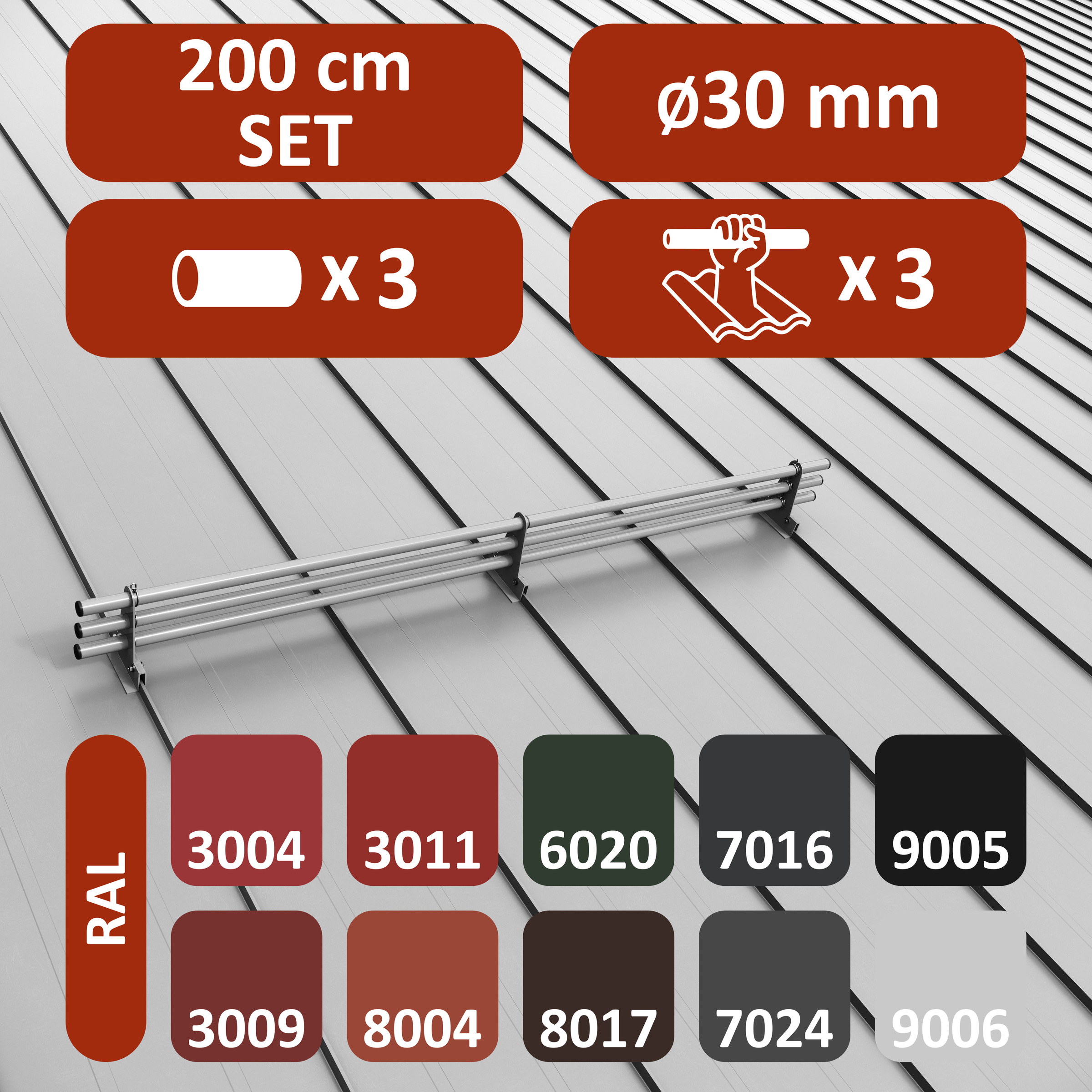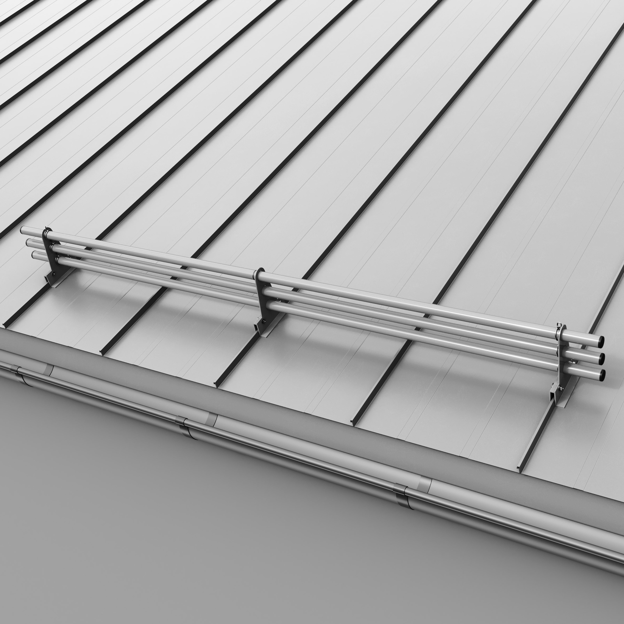 Kompletny zestaw ochrony rurowej RABEK składa się z rury i uchwytów. Uchwyt przykręcamy do rąbka stojącego tak, aby ruchomy element klamry dopasował się do zamka blachy. Klamrę wspornika zamykamy poprzez skręcenie jej śrubami zamkowymi M8x35. Ze względu na ograniczony dostęp do nakrętek zalecane jest użycie klucza grzechotki z nasadką nr 13. Montaż rury do uchwytu nie wymaga stosowania połączeń śrubowych. Liczba uchwytów potrzebnych do zamontowania rury zależy od kąta nachylenia dachu (im większy kąt, tym większa liczba uchwytów) oraz długości połaci. Dla dachów o długości połaci powyżej 6 m należy zwiększyć liczbę uchwytów lub zastosować drugi rząd ochrony rurowej.