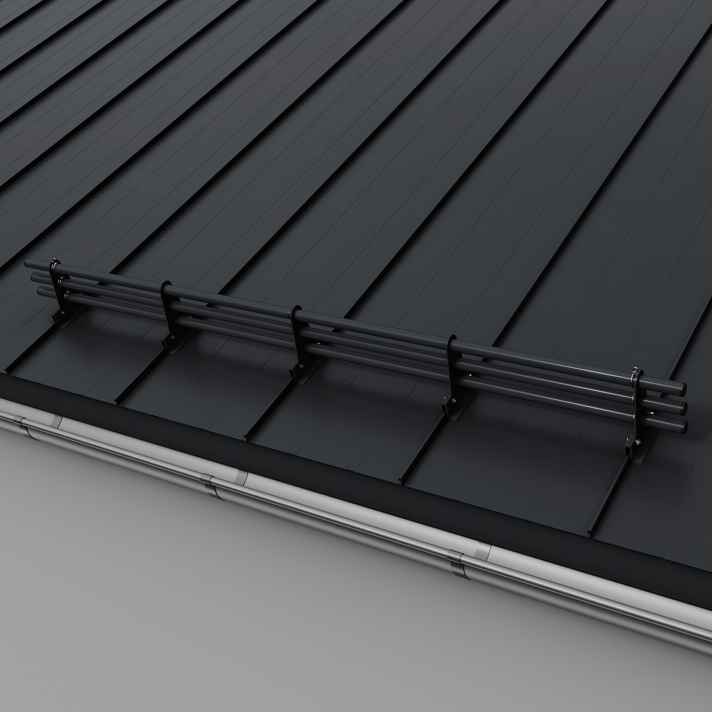 Kompletny zestaw ochrony rurowej RABEK składa się z rury i uchwytów. Uchwyt przykręcamy do rąbka stojącego tak, aby ruchomy element klamry dopasował się do zamka blachy. Klamrę wspornika zamykamy poprzez skręcenie jej śrubami zamkowymi M8x35. Ze względu na ograniczony dostęp do nakrętek zalecane jest użycie klucza grzechotki z nasadką nr 13. Montaż rury do uchwytu nie wymaga stosowania połączeń śrubowych. Liczba uchwytów potrzebnych do zamontowania rury zależy od kąta nachylenia dachu (im większy kąt, tym większa liczba uchwytów) oraz długości połaci. Dla dachów o długości połaci powyżej 6 m należy zwiększyć liczbę uchwytów lub zastosować drugi rząd ochrony rurowej.