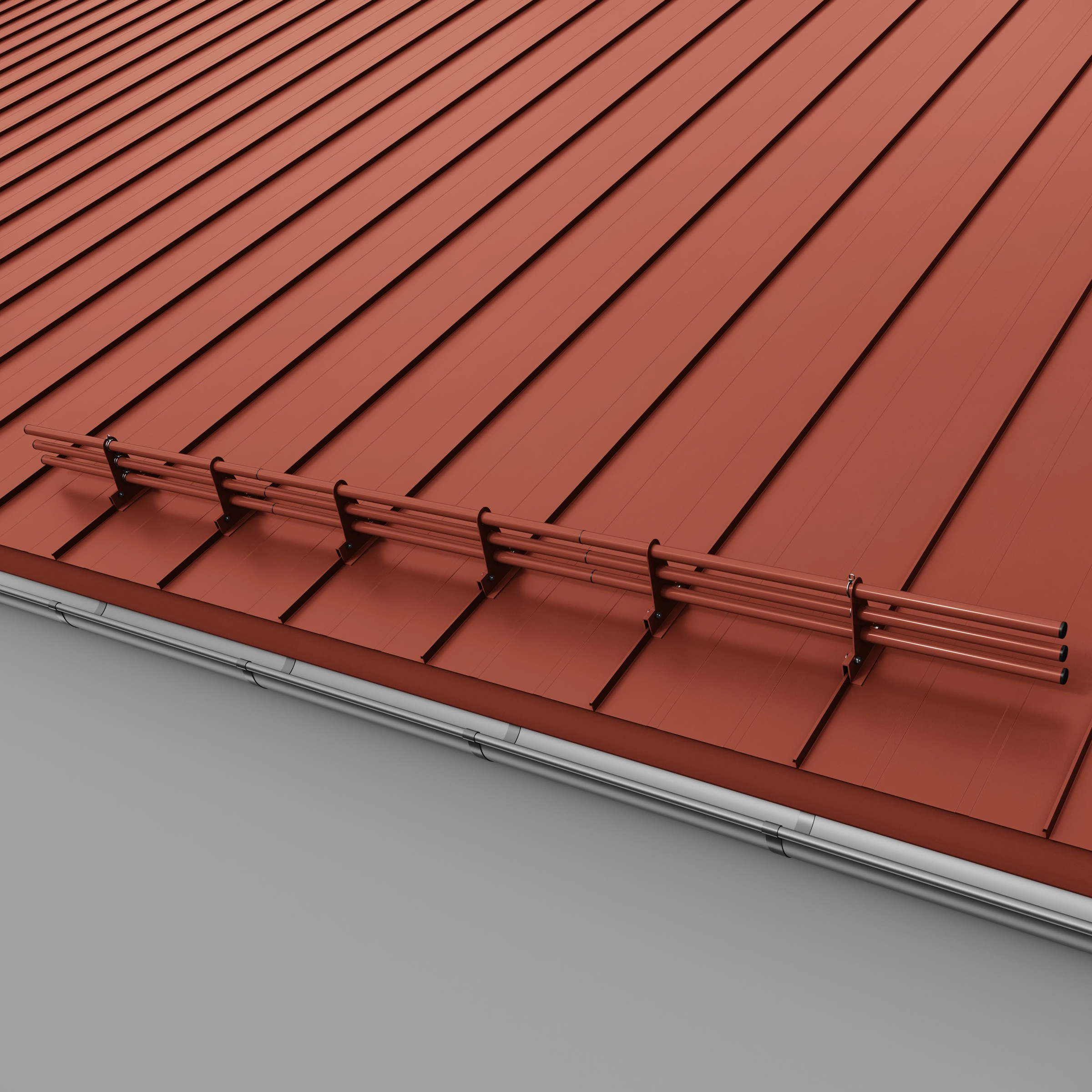 Kompletny zestaw ochrony rurowej RABEK składa się z rury i uchwytów. Uchwyt przykręcamy do rąbka stojącego tak, aby ruchomy element klamry dopasował się do zamka blachy. Klamrę wspornika zamykamy poprzez skręcenie jej śrubami zamkowymi M8x35. Ze względu na ograniczony dostęp do nakrętek zalecane jest użycie klucza grzechotki z nasadką nr 13. Montaż rury do uchwytu nie wymaga stosowania połączeń śrubowych. Liczba uchwytów potrzebnych do zamontowania rury zależy od kąta nachylenia dachu (im większy kąt, tym większa liczba uchwytów) oraz długości połaci. Dla dachów o długości połaci powyżej 6 m należy zwiększyć liczbę uchwytów lub zastosować drugi rząd ochrony rurowej.