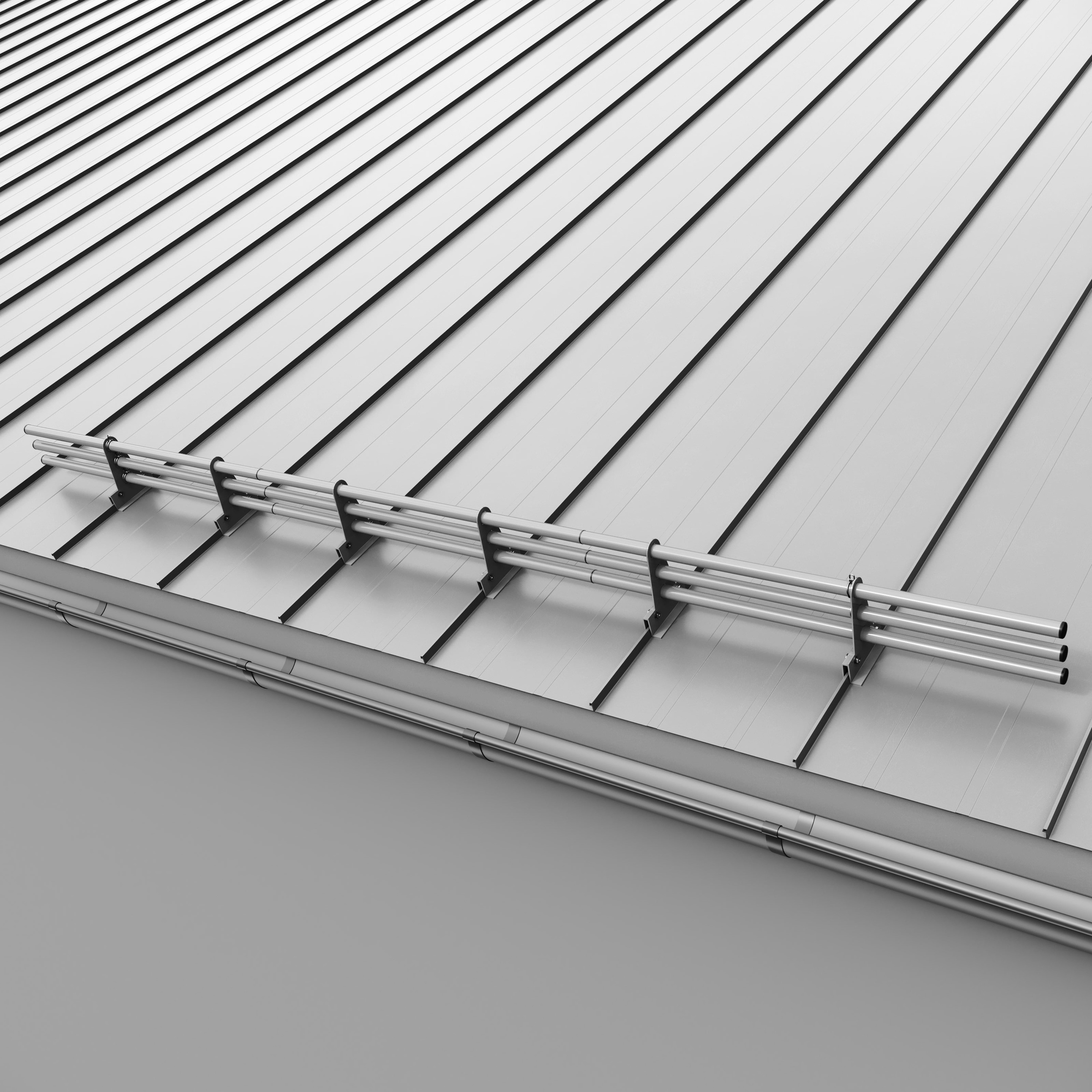 Kompletny zestaw ochrony rurowej RABEK składa się z rury i uchwytów. Uchwyt przykręcamy do rąbka stojącego tak, aby ruchomy element klamry dopasował się do zamka blachy. Klamrę wspornika zamykamy poprzez skręcenie jej śrubami zamkowymi M8x35. Ze względu na ograniczony dostęp do nakrętek zalecane jest użycie klucza grzechotki z nasadką nr 13. Montaż rury do uchwytu nie wymaga stosowania połączeń śrubowych. Liczba uchwytów potrzebnych do zamontowania rury zależy od kąta nachylenia dachu (im większy kąt, tym większa liczba uchwytów) oraz długości połaci. Dla dachów o długości połaci powyżej 6 m należy zwiększyć liczbę uchwytów lub zastosować drugi rząd ochrony rurowej.
