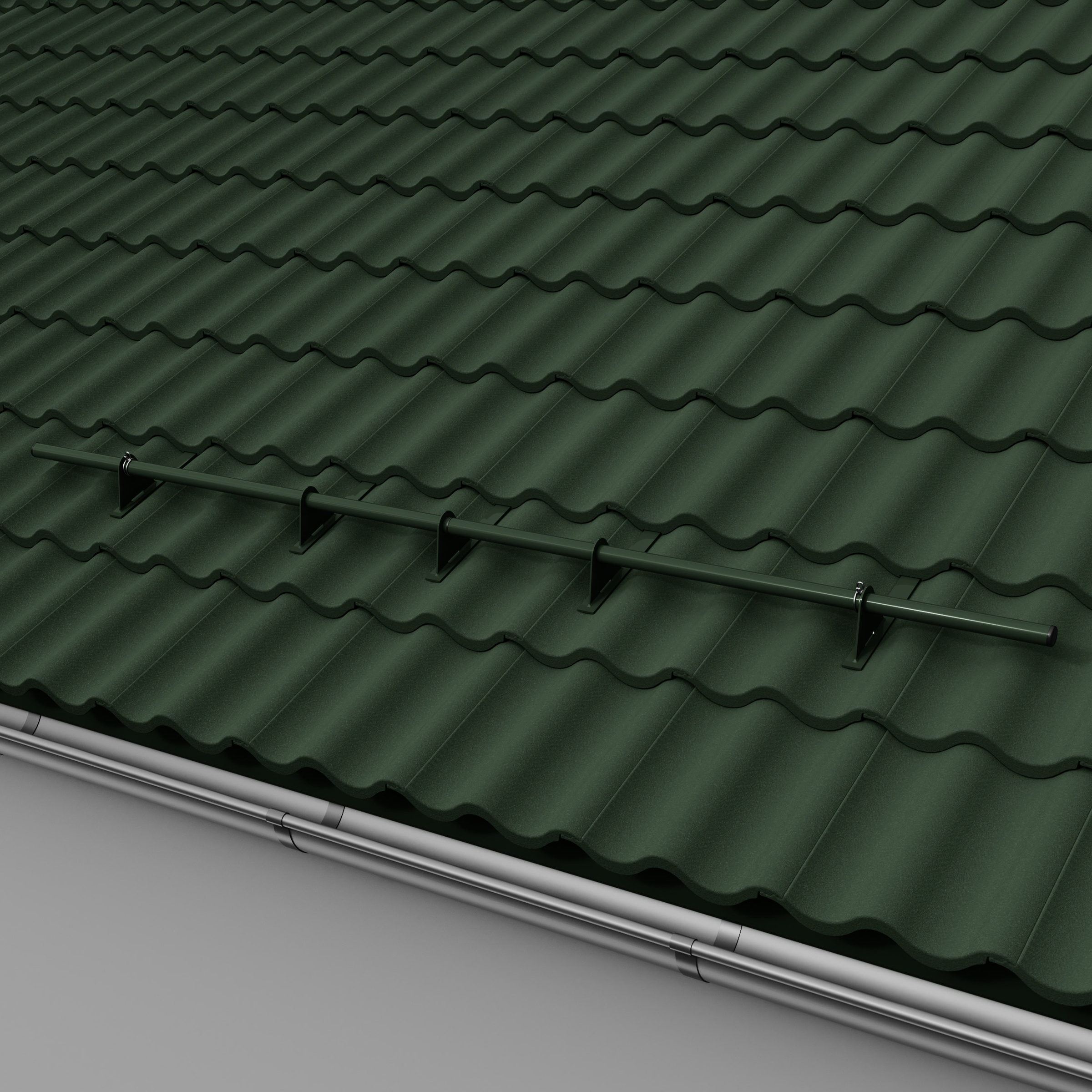 Komplet systemu rur przeciwśniegowych DZLN1 składa się z uchwytów z 1,2 lub 3 otworami i rury przeciwśniegowej. Prosty i szybki montaż tego uchwytu nie wymaga stosowania łaty pomocniczej. Montaż zestawu należy wykonać na wysokości murłaty lub w odległości nie większej niż 800 mm od niej. W pierwszej kolejności montujemy uchwyt rurowy zaczepiając go o łatę i dachówkę w jej górnej części. W dachówce, na której leży uchwyt zaleca się wykonanie wycięcie w kształcie "u" tak aby "zaczep" uchwytu oparty był o łatę a nie o grzbiet dachówki. Do montażu stosujemy wkręty do drewna z łbem stożkowym o wymiarach minimalnych Ø 6 mm x 50 mm. Przed przykręceniem można wstępnie nawiercić otwór o średnicy mniejszej niż średnica wkręta, tak aby zapobiec pękaniu drewna. W dachówce z następnego rzędu, przykrywającej uchwyt należy zeszlifować zamek na szerokość wspornika powiększoną o ok. 1 cm co wyeliminuje efekt unoszenia dachówek. Montaż rur do uchwytu odbywa się poprzez wsunięcie ich w otwory wspornika i nie wymaga stosowania połączeń śrubowych. Ilość uchwytów potrzebnych do zamontowania rur zależy od kąta nachylenia dachu (im większy kąt tym większa ilość uchwytów) oraz długości połaci. Dla dachów o długości połaci powyżej 6 m należy zwiększyć ilość uchwytów lub zastosować drugi rząd rur.