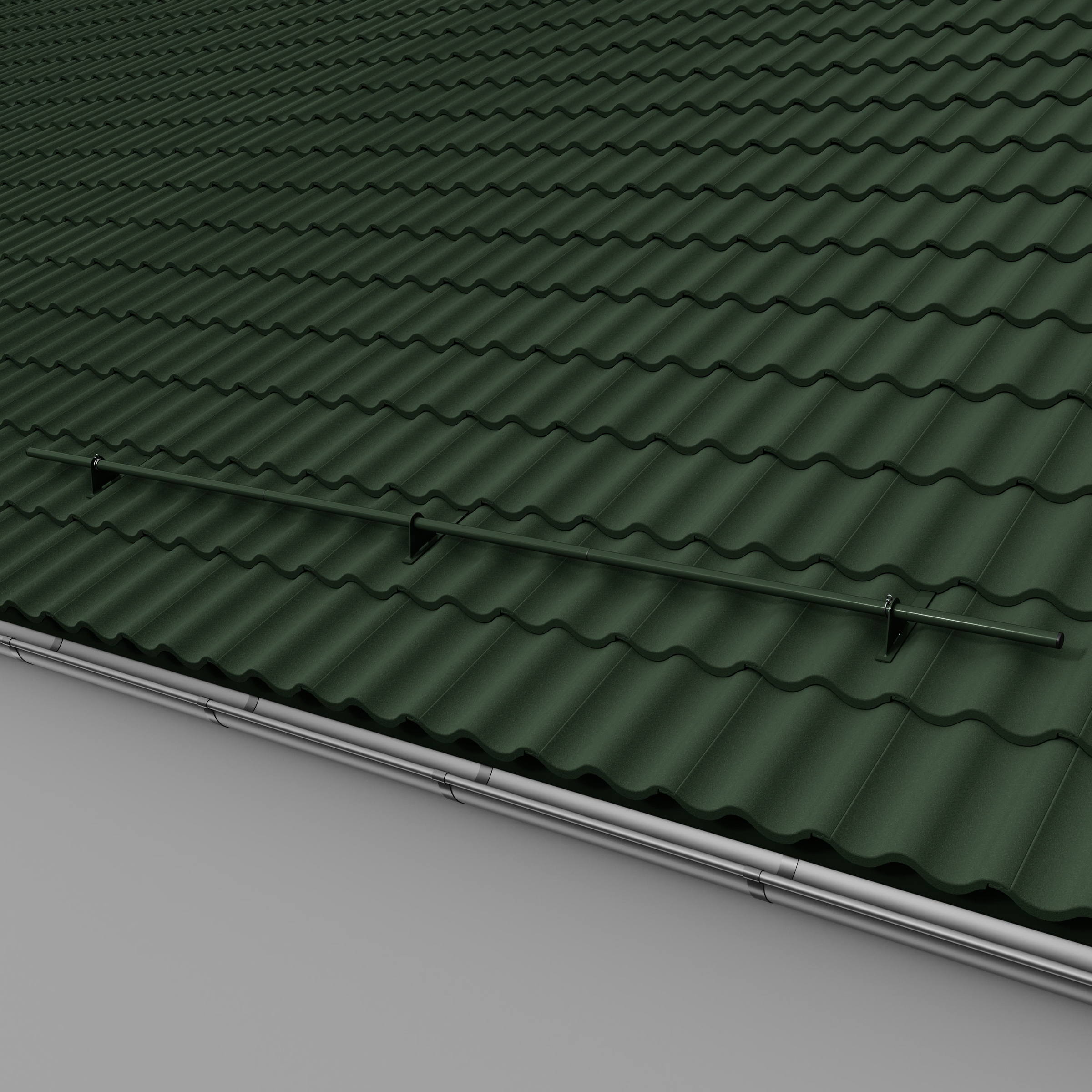 Komplet systemu rur przeciwśniegowych DZLN1 składa się z uchwytów z 1,2 lub 3 otworami i rury przeciwśniegowej. Prosty i szybki montaż tego uchwytu nie wymaga stosowania łaty pomocniczej. Montaż zestawu należy wykonać na wysokości murłaty lub w odległości nie większej niż 800 mm od niej. W pierwszej kolejności montujemy uchwyt rurowy zaczepiając go o łatę i dachówkę w jej górnej części. W dachówce, na której leży uchwyt zaleca się wykonanie wycięcie w kształcie "u" tak aby "zaczep" uchwytu oparty był o łatę a nie o grzbiet dachówki. Do montażu stosujemy wkręty do drewna z łbem stożkowym o wymiarach minimalnych Ø 6 mm x 50 mm. Przed przykręceniem można wstępnie nawiercić otwór o średnicy mniejszej niż średnica wkręta, tak aby zapobiec pękaniu drewna. W dachówce z następnego rzędu, przykrywającej uchwyt należy zeszlifować zamek na szerokość wspornika powiększoną o ok. 1 cm co wyeliminuje efekt unoszenia dachówek. Montaż rur do uchwytu odbywa się poprzez wsunięcie ich w otwory wspornika i nie wymaga stosowania połączeń śrubowych. Ilość uchwytów potrzebnych do zamontowania rur zależy od kąta nachylenia dachu (im większy kąt tym większa ilość uchwytów) oraz długości połaci. Dla dachów o długości połaci powyżej 6 m należy zwiększyć ilość uchwytów lub zastosować drugi rząd rur.