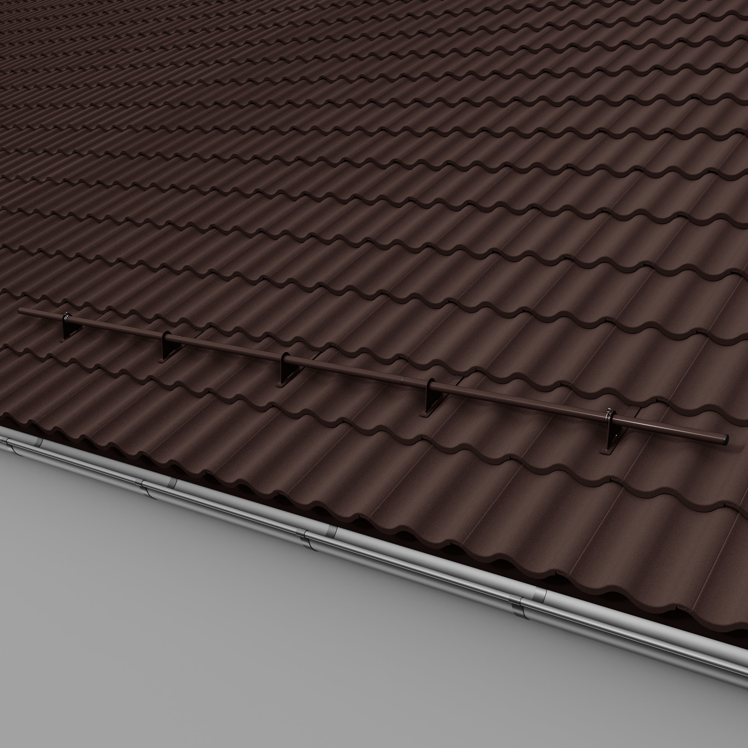 Komplet systemu rur przeciwśniegowych DZLN1 składa się z uchwytów z 1,2 lub 3 otworami i rury przeciwśniegowej. Prosty i szybki montaż tego uchwytu nie wymaga stosowania łaty pomocniczej. Montaż zestawu należy wykonać na wysokości murłaty lub w odległości nie większej niż 800 mm od niej. W pierwszej kolejności montujemy uchwyt rurowy zaczepiając go o łatę i dachówkę w jej górnej części. W dachówce, na której leży uchwyt zaleca się wykonanie wycięcie w kształcie "u" tak aby "zaczep" uchwytu oparty był o łatę a nie o grzbiet dachówki. Do montażu stosujemy wkręty do drewna z łbem stożkowym o wymiarach minimalnych Ø 6 mm x 50 mm. Przed przykręceniem można wstępnie nawiercić otwór o średnicy mniejszej niż średnica wkręta, tak aby zapobiec pękaniu drewna. W dachówce z następnego rzędu, przykrywającej uchwyt należy zeszlifować zamek na szerokość wspornika powiększoną o ok. 1 cm co wyeliminuje efekt unoszenia dachówek. Montaż rur do uchwytu odbywa się poprzez wsunięcie ich w otwory wspornika i nie wymaga stosowania połączeń śrubowych. Ilość uchwytów potrzebnych do zamontowania rur zależy od kąta nachylenia dachu (im większy kąt tym większa ilość uchwytów) oraz długości połaci. Dla dachów o długości połaci powyżej 6 m należy zwiększyć ilość uchwytów lub zastosować drugi rząd rur.