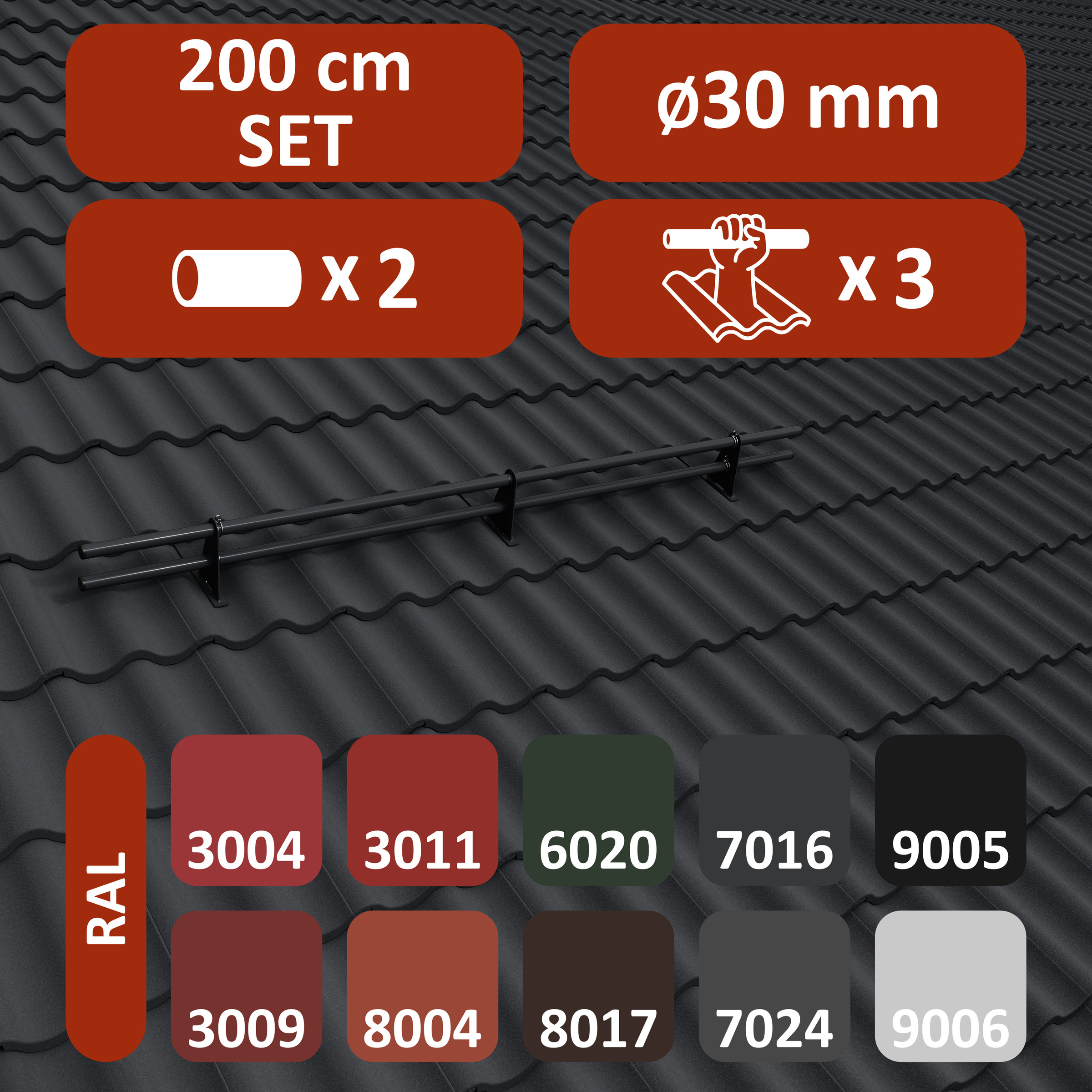 • Komplet ochrony rurowej dostępny w długościach 200 cm i 300 cm. Występuje w 10 kolorach. Zestawy zawierają 3, 4 lub 5 uchwytów – w zależności od kąta nachylenia dachu. Typ mocowania: LN.