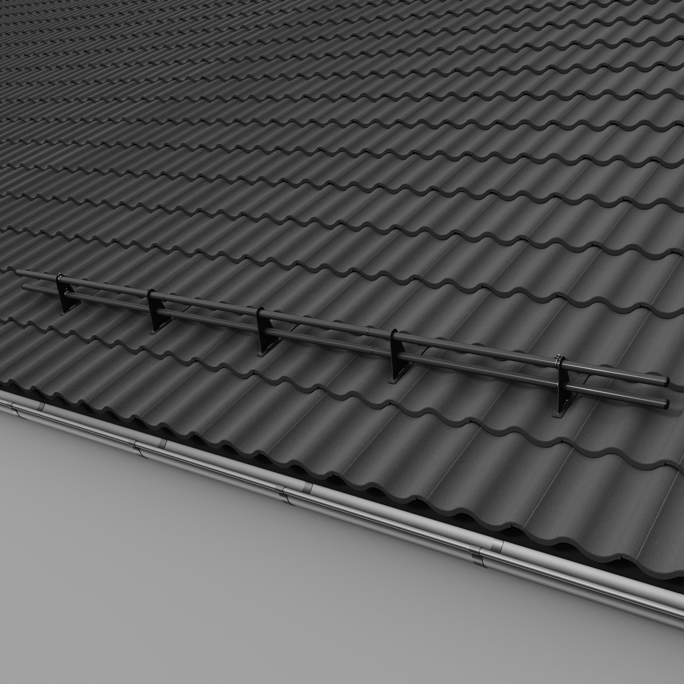 Komplet systemu rur przeciwśniegowych DZLN1 składa się z uchwytów z 1,2 lub 3 otworami i rury przeciwśniegowej. Prosty i szybki montaż tego uchwytu nie wymaga stosowania łaty pomocniczej. Montaż zestawu należy wykonać na wysokości murłaty lub w odległości nie większej niż 800 mm od niej. W pierwszej kolejności montujemy uchwyt rurowy zaczepiając go o łatę i dachówkę w jej górnej części. W dachówce, na której leży uchwyt zaleca się wykonanie wycięcie w kształcie "u" tak aby "zaczep" uchwytu oparty był o łatę a nie o grzbiet dachówki. Do montażu stosujemy wkręty do drewna z łbem stożkowym o wymiarach minimalnych Ø 6 mm x 50 mm. Przed przykręceniem można wstępnie nawiercić otwór o średnicy mniejszej niż średnica wkręta, tak aby zapobiec pękaniu drewna. W dachówce z następnego rzędu, przykrywającej uchwyt należy zeszlifować zamek na szerokość wspornika powiększoną o ok. 1 cm co wyeliminuje efekt unoszenia dachówek. Montaż rur do uchwytu odbywa się poprzez wsunięcie ich w otwory wspornika i nie wymaga stosowania połączeń śrubowych. Ilość uchwytów potrzebnych do zamontowania rur zależy od kąta nachylenia dachu (im większy kąt tym większa ilość uchwytów) oraz długości połaci. Dla dachów o długości połaci powyżej 6 m należy zwiększyć ilość uchwytów lub zastosować drugi rząd rur.