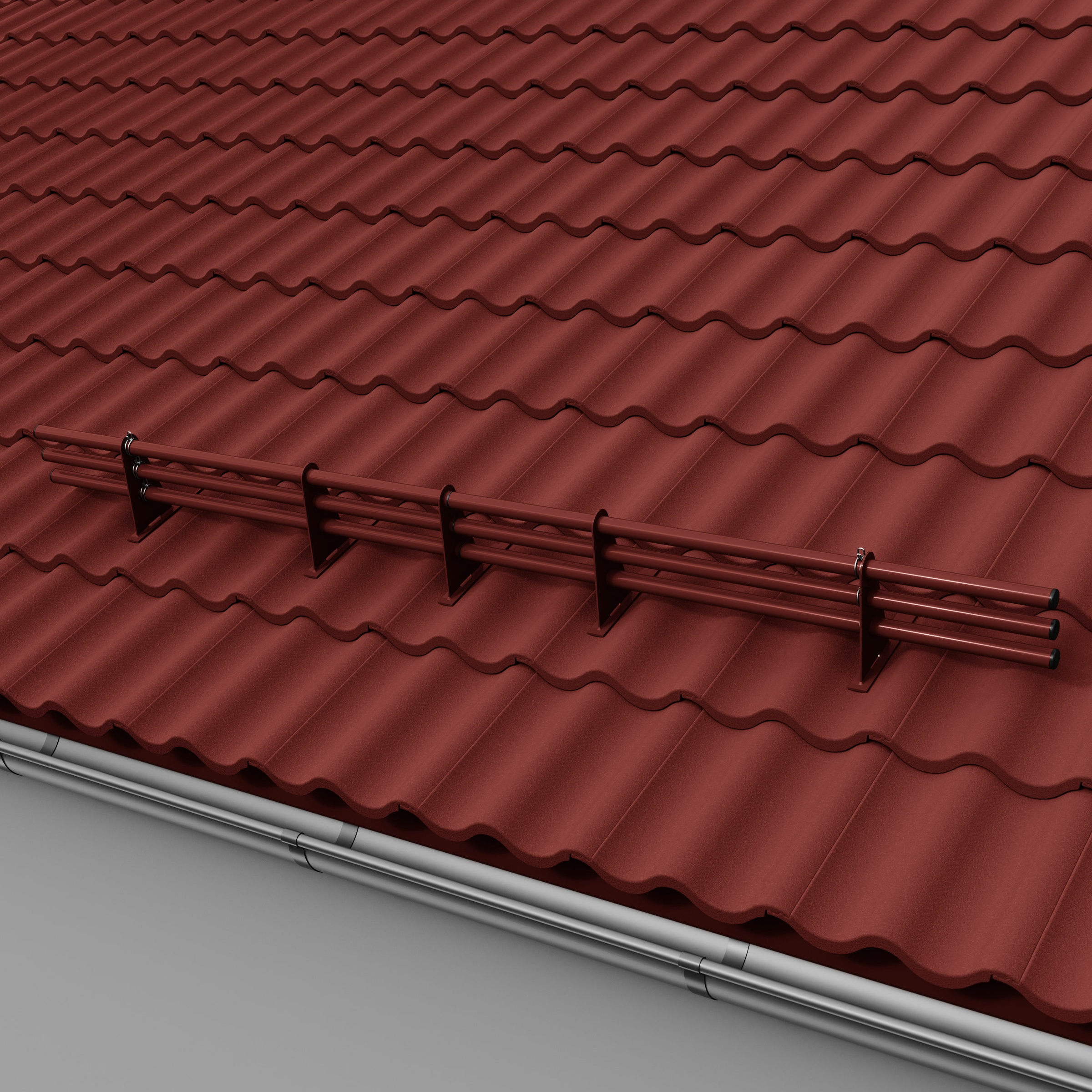 Komplet systemu rur przeciwśniegowych DZLN1 składa się z uchwytów z 1,2 lub 3 otworami i rury przeciwśniegowej. Prosty i szybki montaż tego uchwytu nie wymaga stosowania łaty pomocniczej. Montaż zestawu należy wykonać na wysokości murłaty lub w odległości nie większej niż 800 mm od niej. W pierwszej kolejności montujemy uchwyt rurowy zaczepiając go o łatę i dachówkę w jej górnej części. W dachówce, na której leży uchwyt zaleca się wykonanie wycięcie w kształcie "u" tak aby "zaczep" uchwytu oparty był o łatę a nie o grzbiet dachówki. Do montażu stosujemy wkręty do drewna z łbem stożkowym o wymiarach minimalnych Ø 6 mm x 50 mm. Przed przykręceniem można wstępnie nawiercić otwór o średnicy mniejszej niż średnica wkręta, tak aby zapobiec pękaniu drewna. W dachówce z następnego rzędu, przykrywającej uchwyt należy zeszlifować zamek na szerokość wspornika powiększoną o ok. 1 cm co wyeliminuje efekt unoszenia dachówek. Montaż rur do uchwytu odbywa się poprzez wsunięcie ich w otwory wspornika i nie wymaga stosowania połączeń śrubowych. Ilość uchwytów potrzebnych do zamontowania rur zależy od kąta nachylenia dachu (im większy kąt tym większa ilość uchwytów) oraz długości połaci. Dla dachów o długości połaci powyżej 6 m należy zwiększyć ilość uchwytów lub zastosować drugi rząd rur.