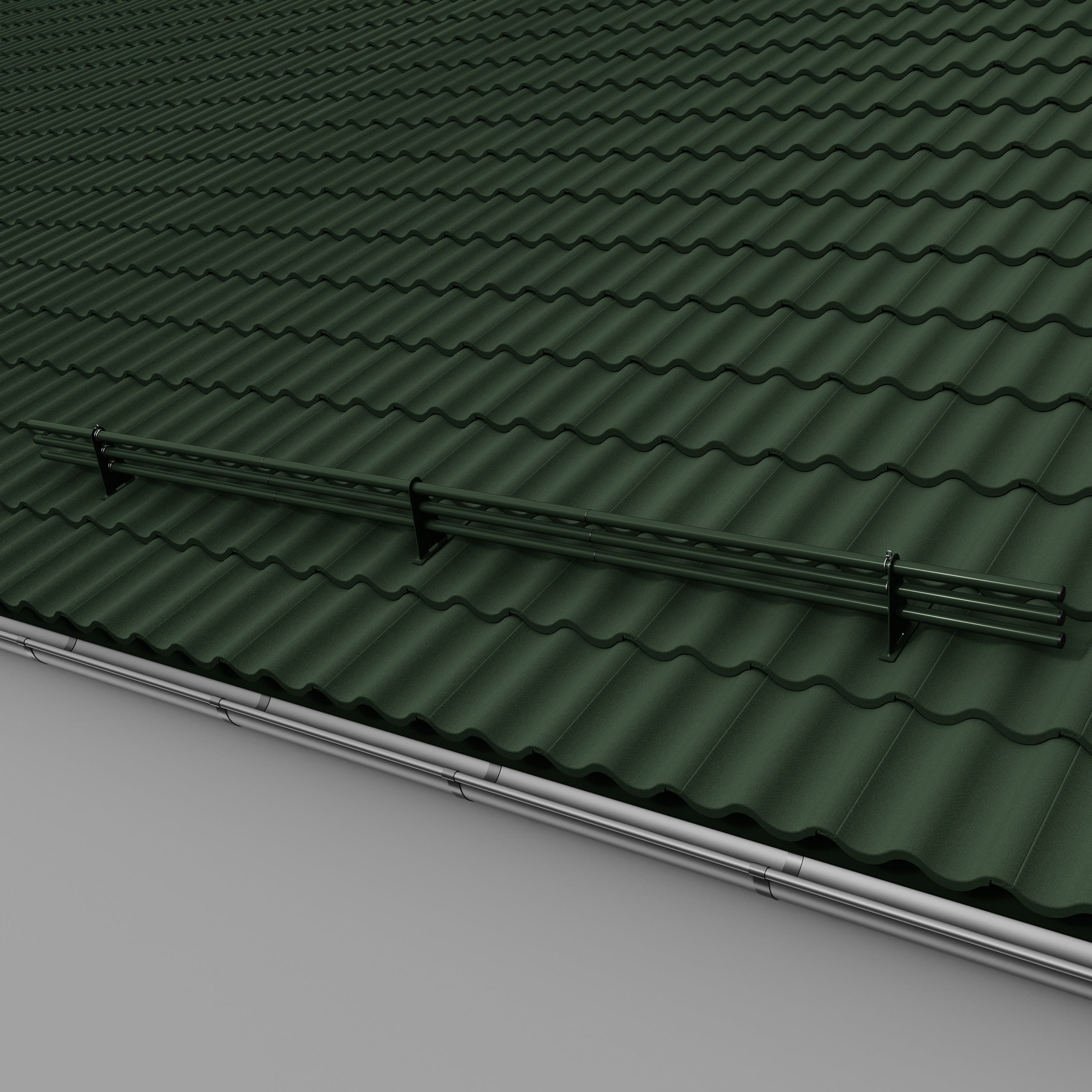 Komplet systemu rur przeciwśniegowych DZLN1 składa się z uchwytów z 1,2 lub 3 otworami i rury przeciwśniegowej. Prosty i szybki montaż tego uchwytu nie wymaga stosowania łaty pomocniczej. Montaż zestawu należy wykonać na wysokości murłaty lub w odległości nie większej niż 800 mm od niej. W pierwszej kolejności montujemy uchwyt rurowy zaczepiając go o łatę i dachówkę w jej górnej części. W dachówce, na której leży uchwyt zaleca się wykonanie wycięcie w kształcie "u" tak aby "zaczep" uchwytu oparty był o łatę a nie o grzbiet dachówki. Do montażu stosujemy wkręty do drewna z łbem stożkowym o wymiarach minimalnych Ø 6 mm x 50 mm. Przed przykręceniem można wstępnie nawiercić otwór o średnicy mniejszej niż średnica wkręta, tak aby zapobiec pękaniu drewna. W dachówce z następnego rzędu, przykrywającej uchwyt należy zeszlifować zamek na szerokość wspornika powiększoną o ok. 1 cm co wyeliminuje efekt unoszenia dachówek. Montaż rur do uchwytu odbywa się poprzez wsunięcie ich w otwory wspornika i nie wymaga stosowania połączeń śrubowych. Ilość uchwytów potrzebnych do zamontowania rur zależy od kąta nachylenia dachu (im większy kąt tym większa ilość uchwytów) oraz długości połaci. Dla dachów o długości połaci powyżej 6 m należy zwiększyć ilość uchwytów lub zastosować drugi rząd rur.