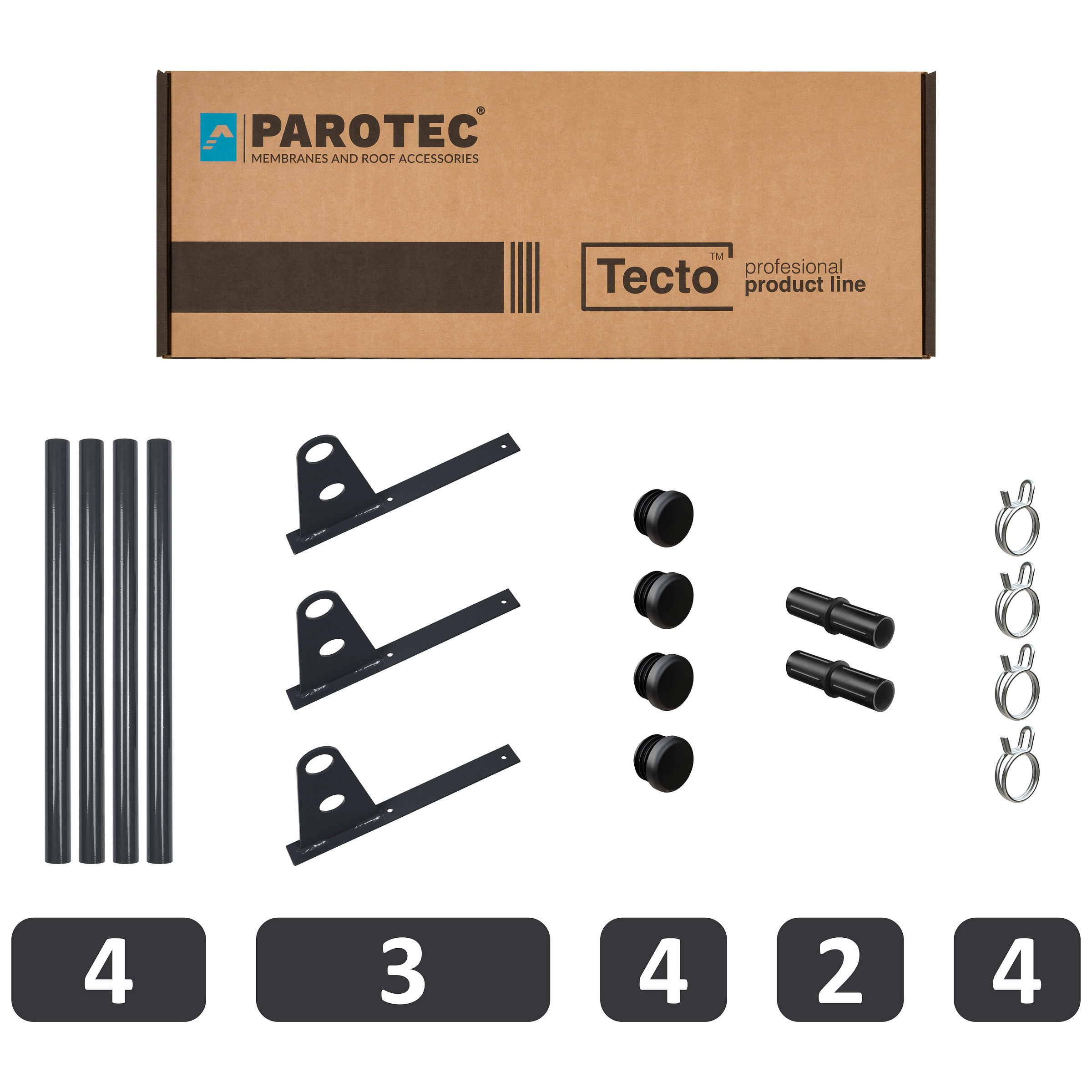 - 4 zaślepki rur – 4 blokady (stopery) – 2 łączniki rur