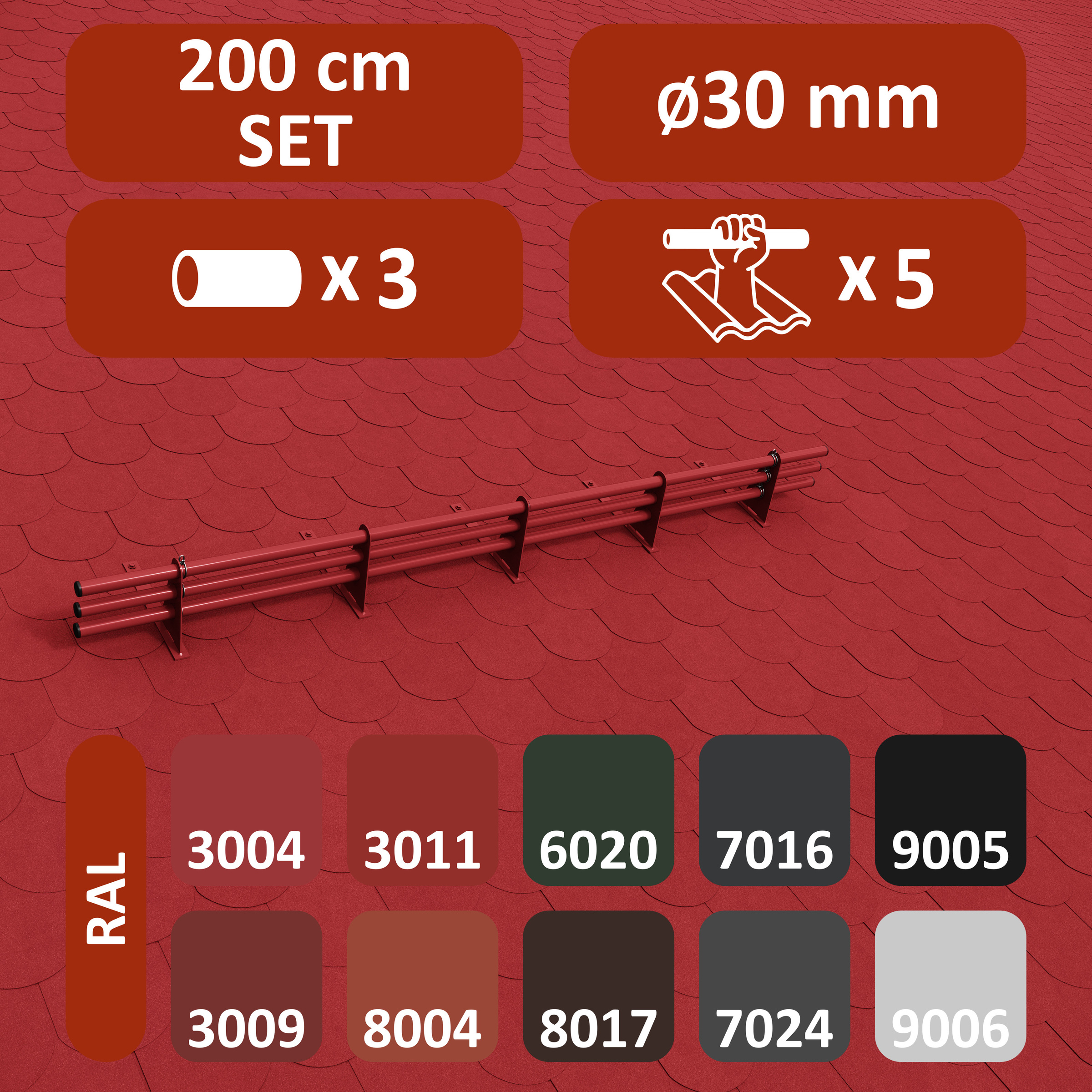 • Komplet ochrony rurowej dostępny w długościach 200 cm i 300 cm. Występuje w 10 kolorach. Zestawy zawierają 3, 4, 5 lub 6 uchwytów – w zależności od kąta nachylenia dachu. Typ mocowania - płaskie.